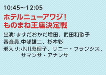 11/9(日)の万博記念公園・下の広場で10時45分から開催の「ホテルニューアワジ!ものまね王座決定戦」を是非、観に来てくださ~い ‼ そして雨よやんでくれ~ ‼ #ラジハン #ホテルニューアワジ #ものまね王座決定戦 #ますだおかだ増田 #武田和歌子 #ABCラジオまつり pic.x.com/LILrwoApcH