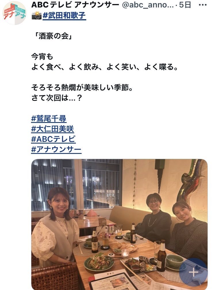 育休中の斎藤真美、塚本麻里衣アナがいれば、酒豪(ザル)五人衆 #武田和歌子 #ABCアナウンサー x.com/abc_announcer/…