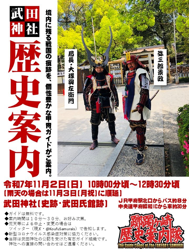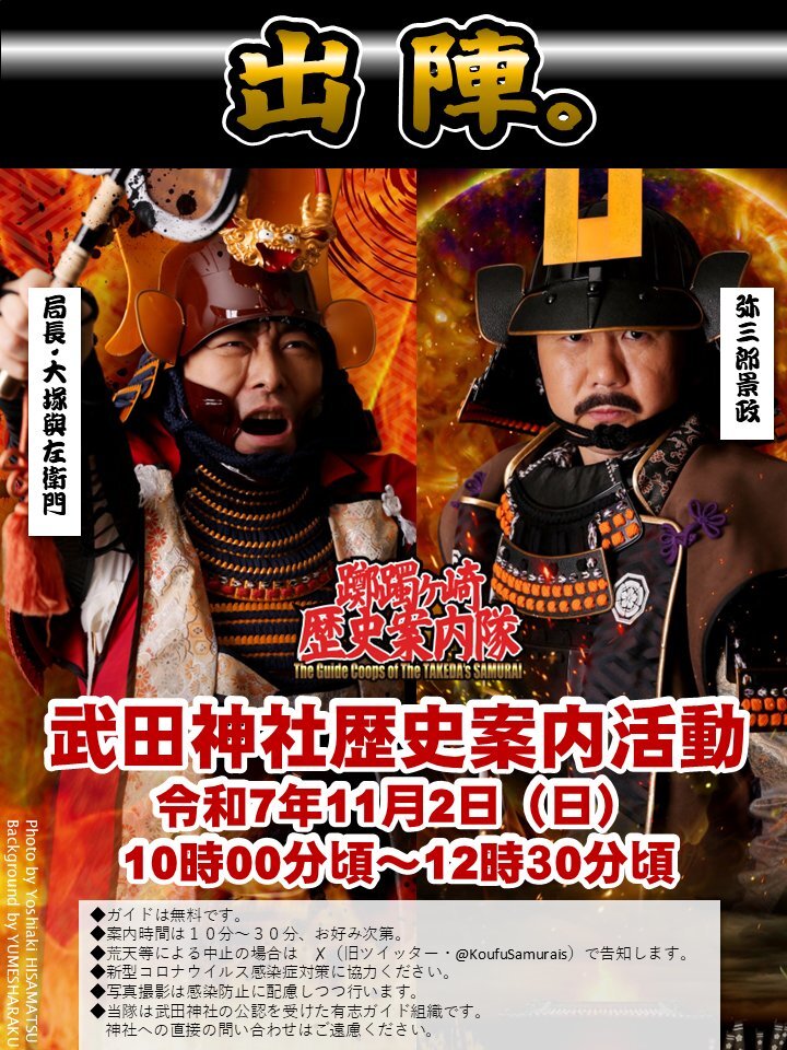 【出陣!】11/2(日)10:00頃~12:30頃、#武田神社 で歴史案内活動を行います。 ❖戦国の遺風残る境内周辺を、個性豊かな甲冑ガイドがご案内 ❖コース・時間は御興味・御都合に合わせて自由自在 ❖宝物殿、ミュージアムの施設も案内OK(要施設入場料)(E)