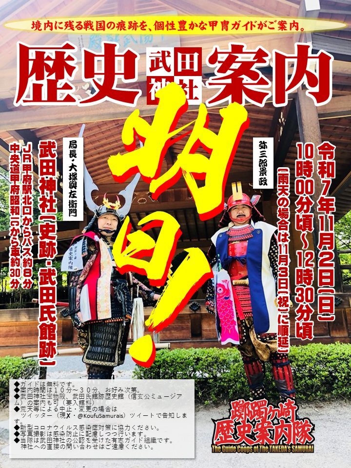 【明日!】11/2(日)10:00頃~12:30頃、#武田神社 で歴史案内活動を行います。 ❖戦国の遺風残る境内周辺を、個性豊かな甲冑ガイドがご案内 ❖コース・時間は御興味・御都合に合わせて自由自在 ❖宝物殿、ミュージアムの施設も案内OK(要施設入場料) ❖雨天等による中止の場合は翌11/3(祝)に順延(E) pic.x.com/X2LXISMyKM