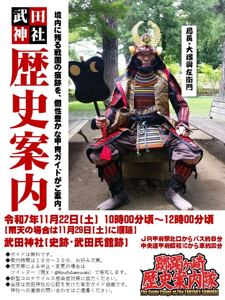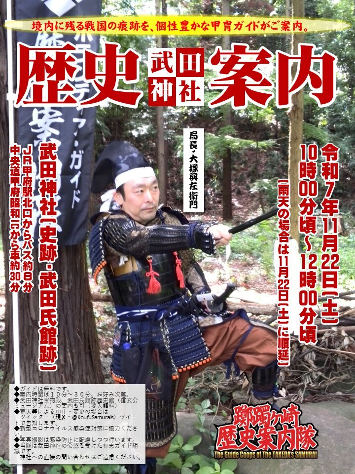 【特報!】11/22(土)10:00頃~12:00頃、#武田神社 で歴史案内活動を行います。 ❖境内に眠る戦国の痕跡を、個性豊かな甲冑ガイドがご案内 ❖ガイドは無料 ❖コース・時間はご都合・ご興味に応じて自由自在 ❖宝物殿・ミュージアムの案内も可 ❖雨天の場合は11/29(土)に順延(E) pic.x.com/GA40gocyHn