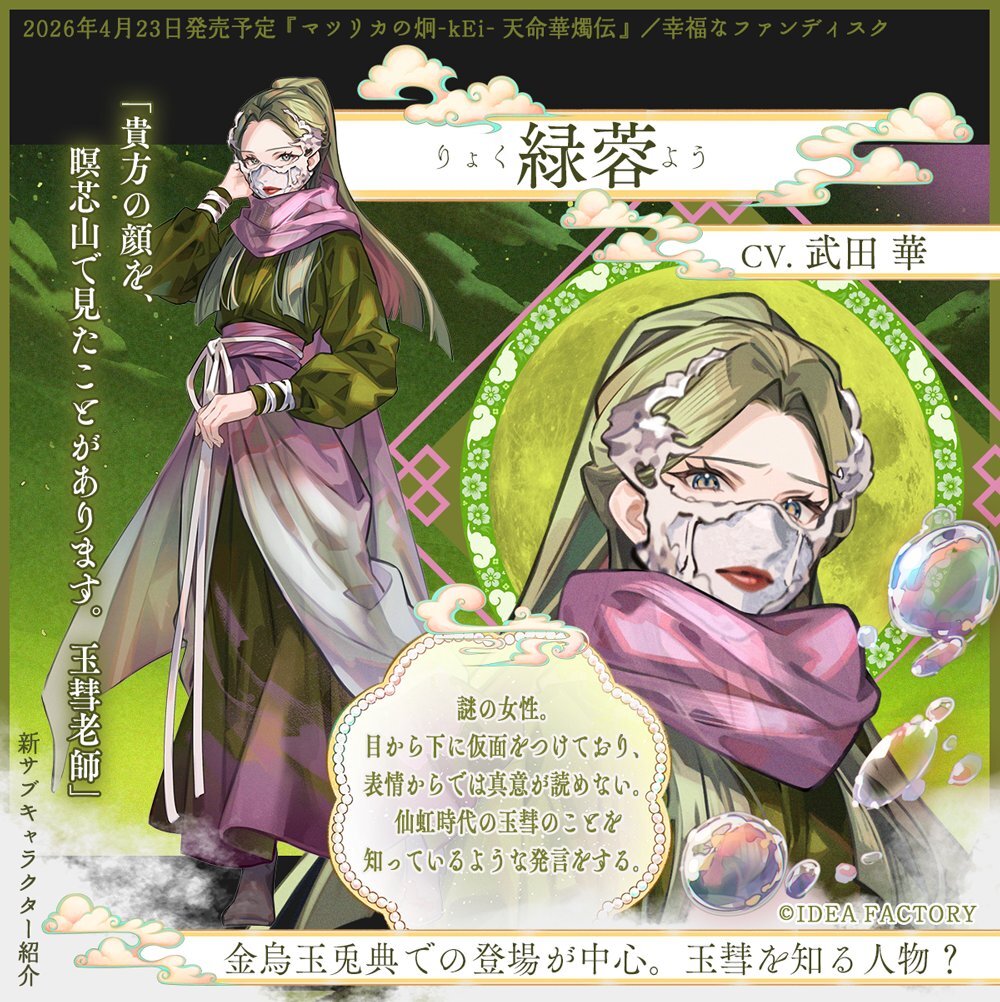 <🍑新サブキャラクター🍑> \緑蓉(りょくよう)/ CV.#武田華 「貴方の顔を、瞑芯山で見たことがあります。玉彗老師」 仙虹時代の玉彗(CV.#前野智昭)を知っているような発言をする――謎の女性。 🎵サンプルボイス公開中🎵 otomate.jp/mk/fd/chara/?p… #オトメイト pic.x.com/D2R14QWvZF x.com/Mk_otomate/sta…