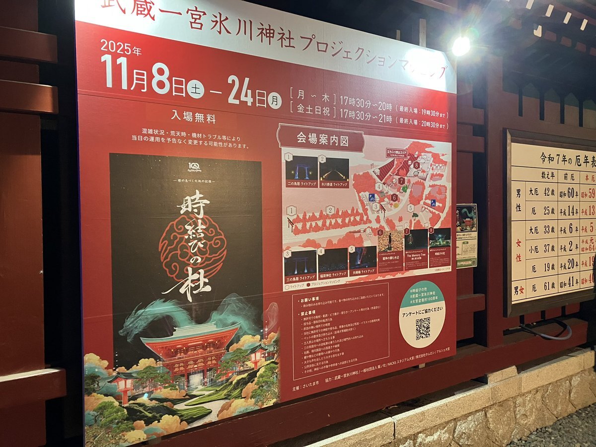 金土日は混むようなので、今日11/20(木)に早めに仕事切り上げて、19:20までに到着しようと思う次第✨⛩️ 同じ考えの人が多くて混む、ことも考えられるかな 19:30が最終入場で、上映約7分 #プロジェクションマッピング #武蔵一宮氷川神社 #氷川神社 x.com/SaitamaCityPR/…
