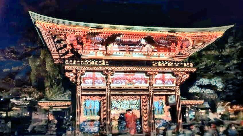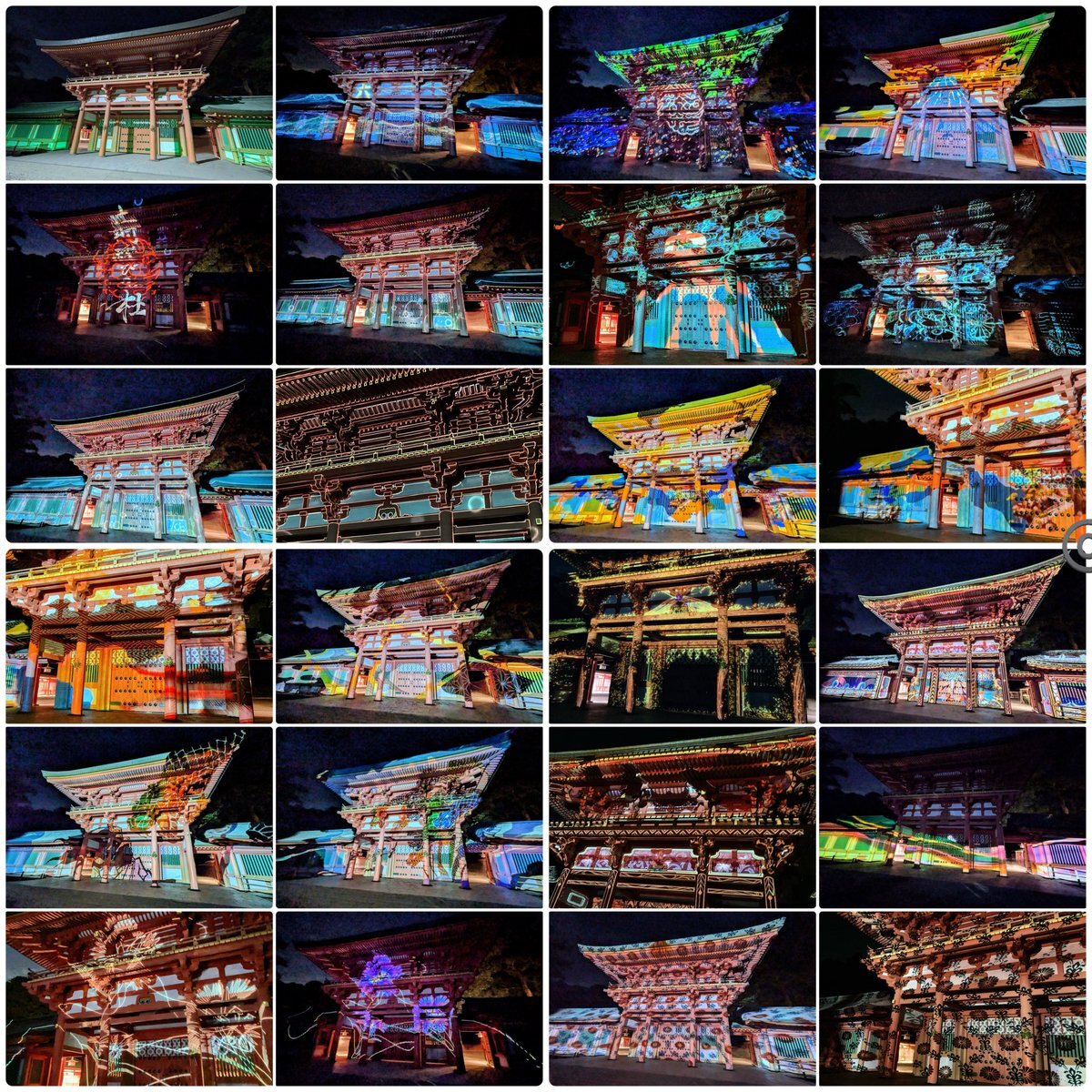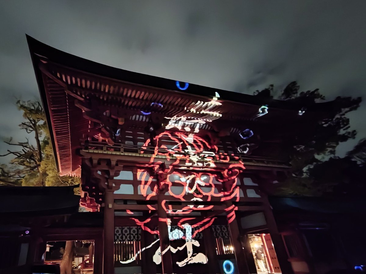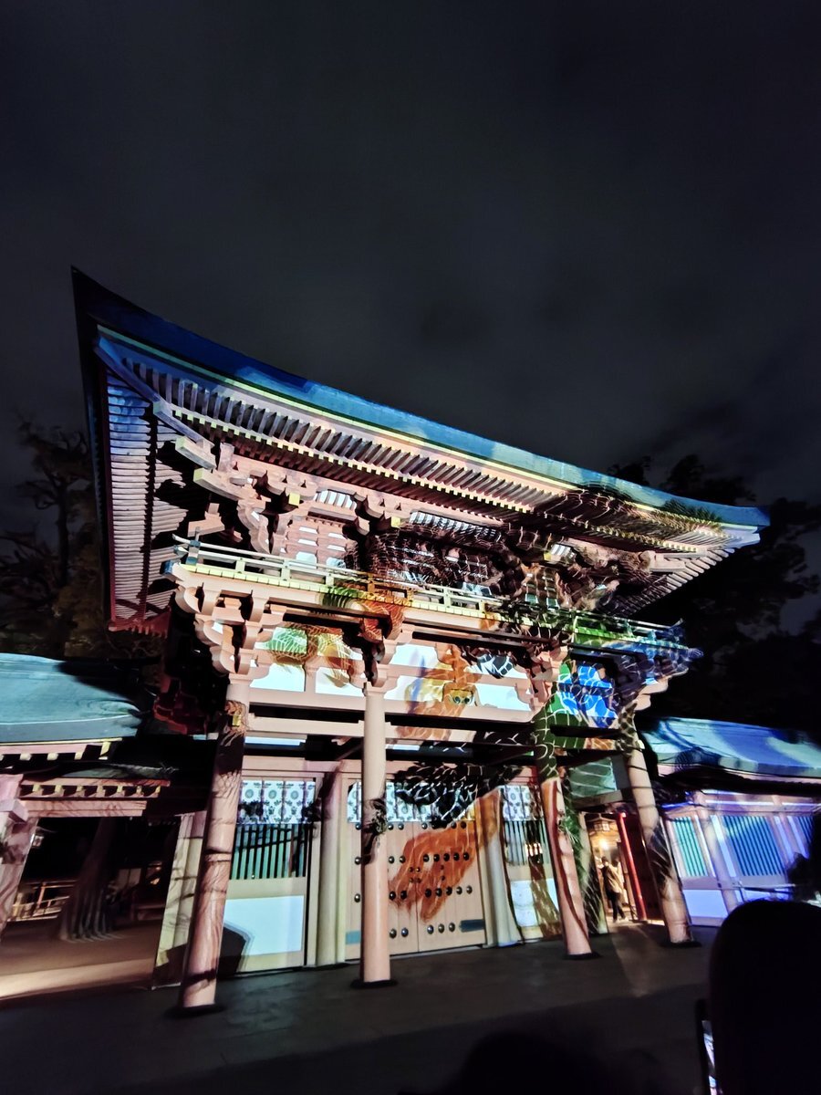 氷川神社でプロジェクションマッピングやってるようで 盆栽村100周年記念のライトアップとか? メインが桜門での7分間の投影! なかなか見応えあったー #武蔵一宮氷川神社 pic.x.com/1NNMAFsCaE