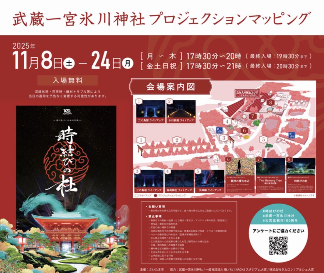 【武蔵一宮氷川神社プロジェクションマッピング「時結びの杜」開催決定!⛩】 【期間】11月8日(金)~11月24日(月・休) ライトアップや、初の試みであるプロジェクションマッピング等で皆様に非日常体験をお届けします✨ 詳細はコチラ⇩ city.saitama.lg.jp/006/014/008/00…