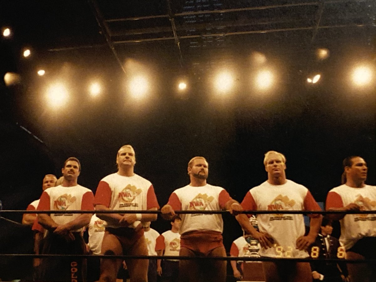 素人の初出し秘蔵写真(216) 1992.8.6 (2) #新日本プロレス #njpw1972 第2回G1開幕戦その2。右から、#テリー・テイラー、#スティーブ・オースチン 、#アーン・アンダーソン、#バリー・ウインダム、#リック・ルード、#トニー・ホーム。注目はスキンヘッド変身前のオースチン! x.com/mamorurero1/st…