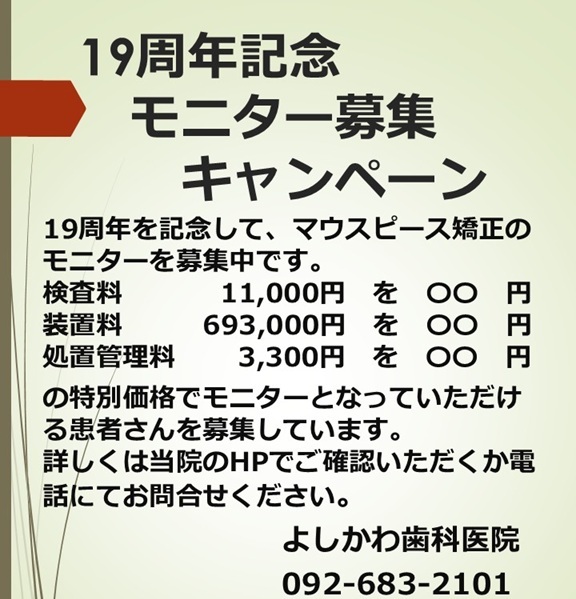 19周年特別キャンペーン 開院19周年を記念して、マウスピース矯正のモニターとなっていただける方を募集しています。 詳しくは当院のHPでご確認いただくか電話にてお問い合わせください。 #歯ならび #かみ合わせ #マウスピース矯正 #千早 #歯科矯正 #インビザライン #シュアスマイルアライナー pic.x.com/4KlwPoLKts
