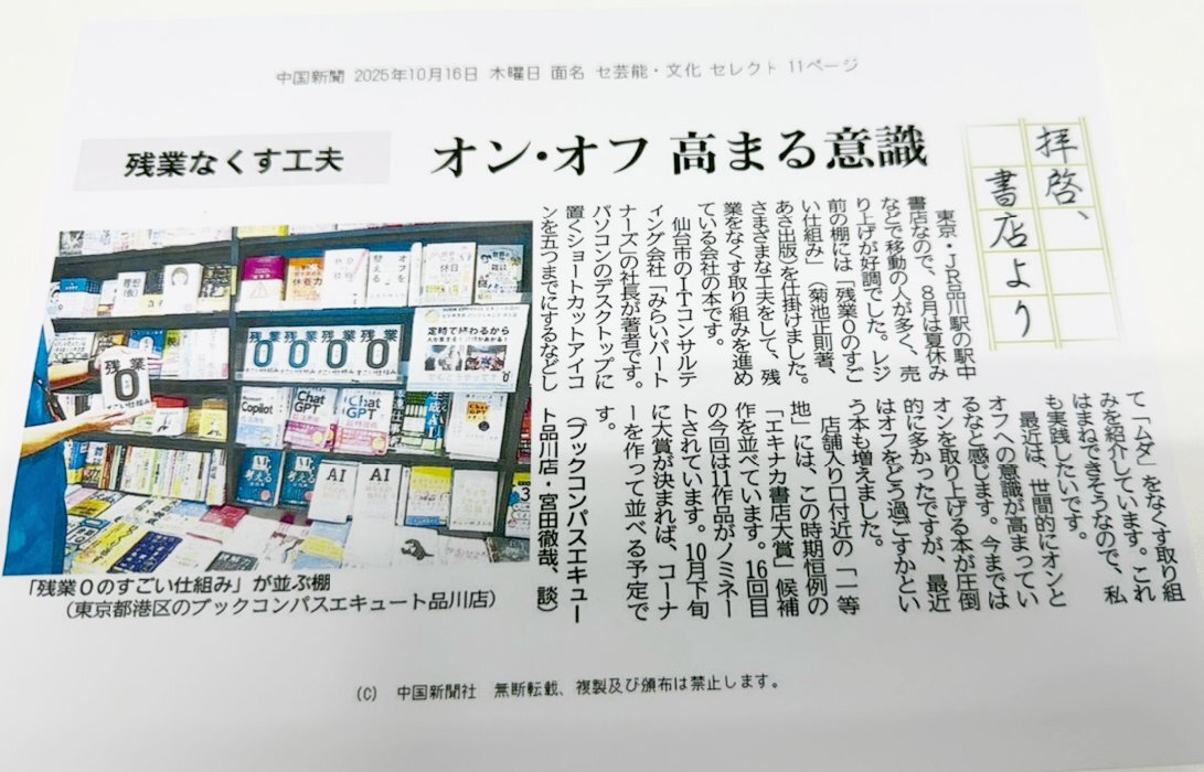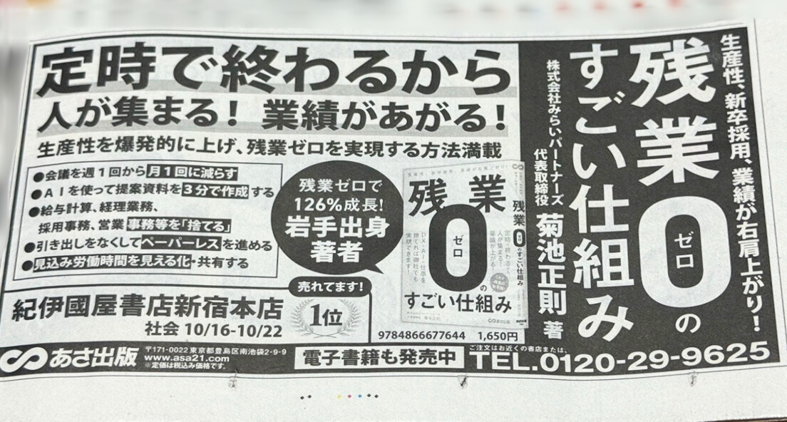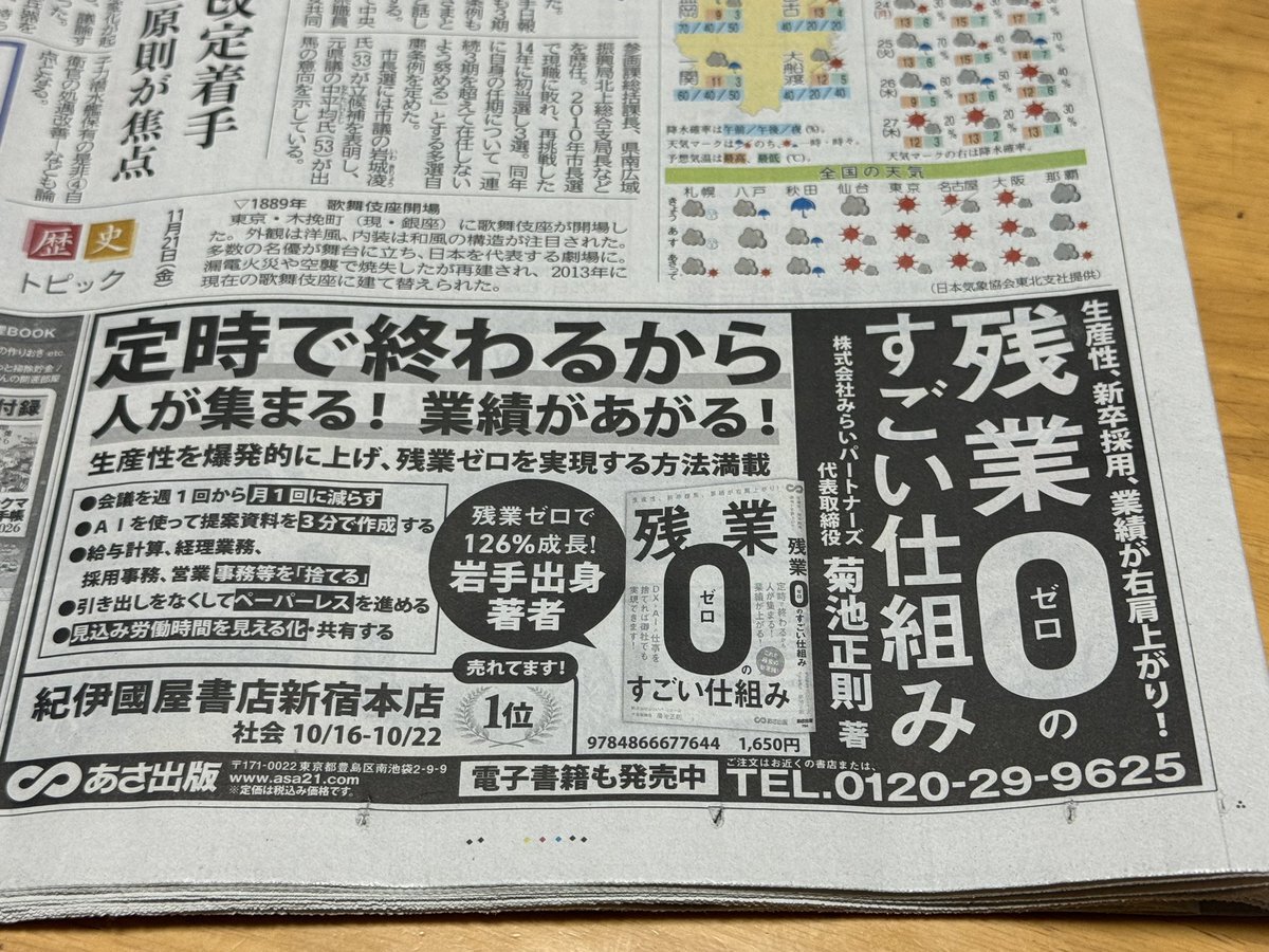 【メディア掲載情報📢】 弊社代表菊池の新刊「残業ゼロのすごい仕組み」の広告が本日、11/21(金)の岩手日報に掲載されました! 出版を記念した東京での無料講演会もございます! 人材不足・属人化に悩む皆様、ぜひご参加ください✨ mirai-ps.com/booklauncheven… #残業ゼロのすごい仕組み #岩手日報 pic.x.com/Q97bWVNIVD