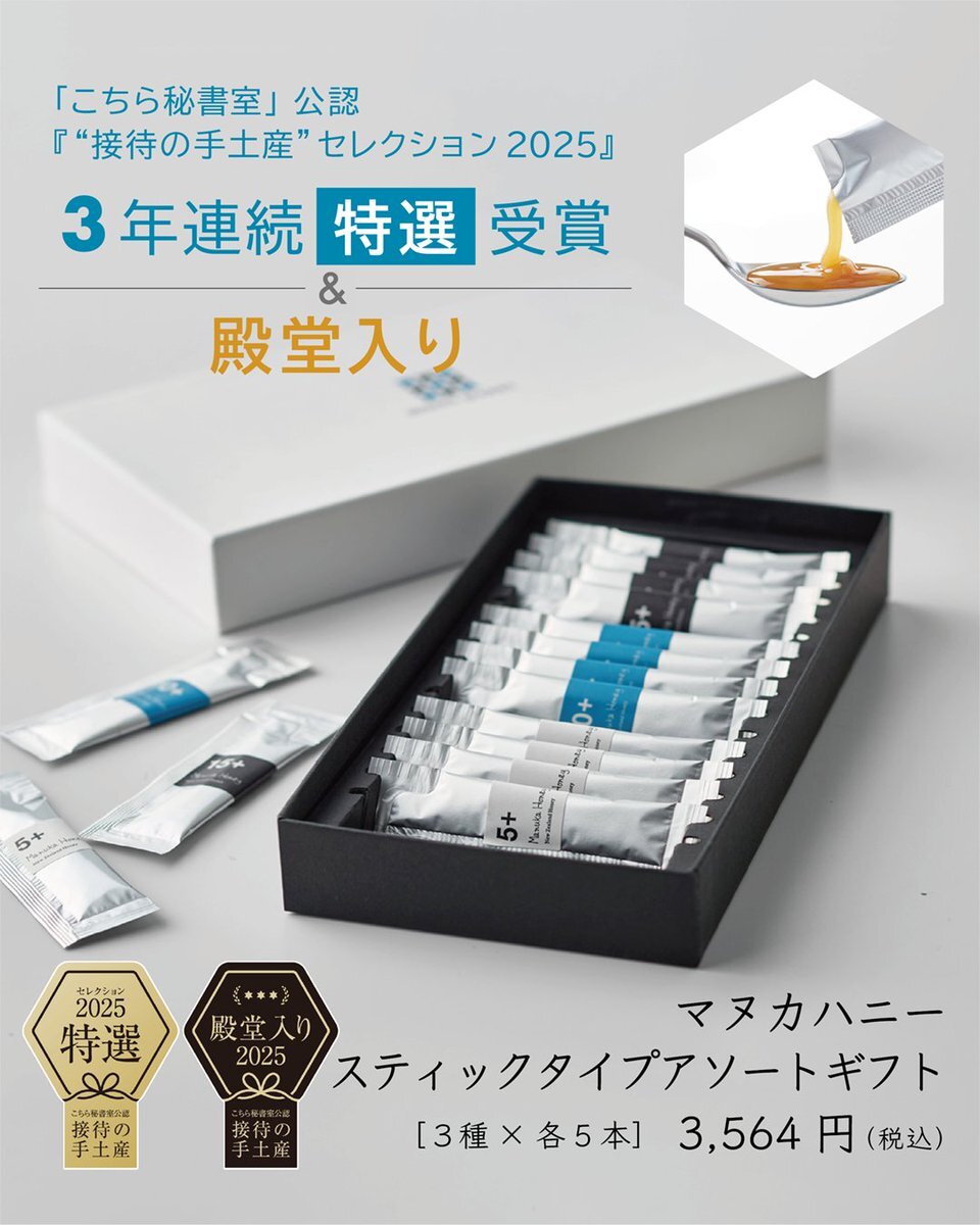 ✨殿堂入り受賞✨ HONEY MARKS「マヌカハニー スティックタイプ アソートギフト」が、接待の手土産セレクション2025で「特選」を3年連続受賞し、ついに殿堂入り! 軽くて上質、日持ちも◎ 冬の贈り物におすすめです✨ #マヌカハニー #接待の手土産 #殿堂入り pic.x.com/BdtR40X0ms