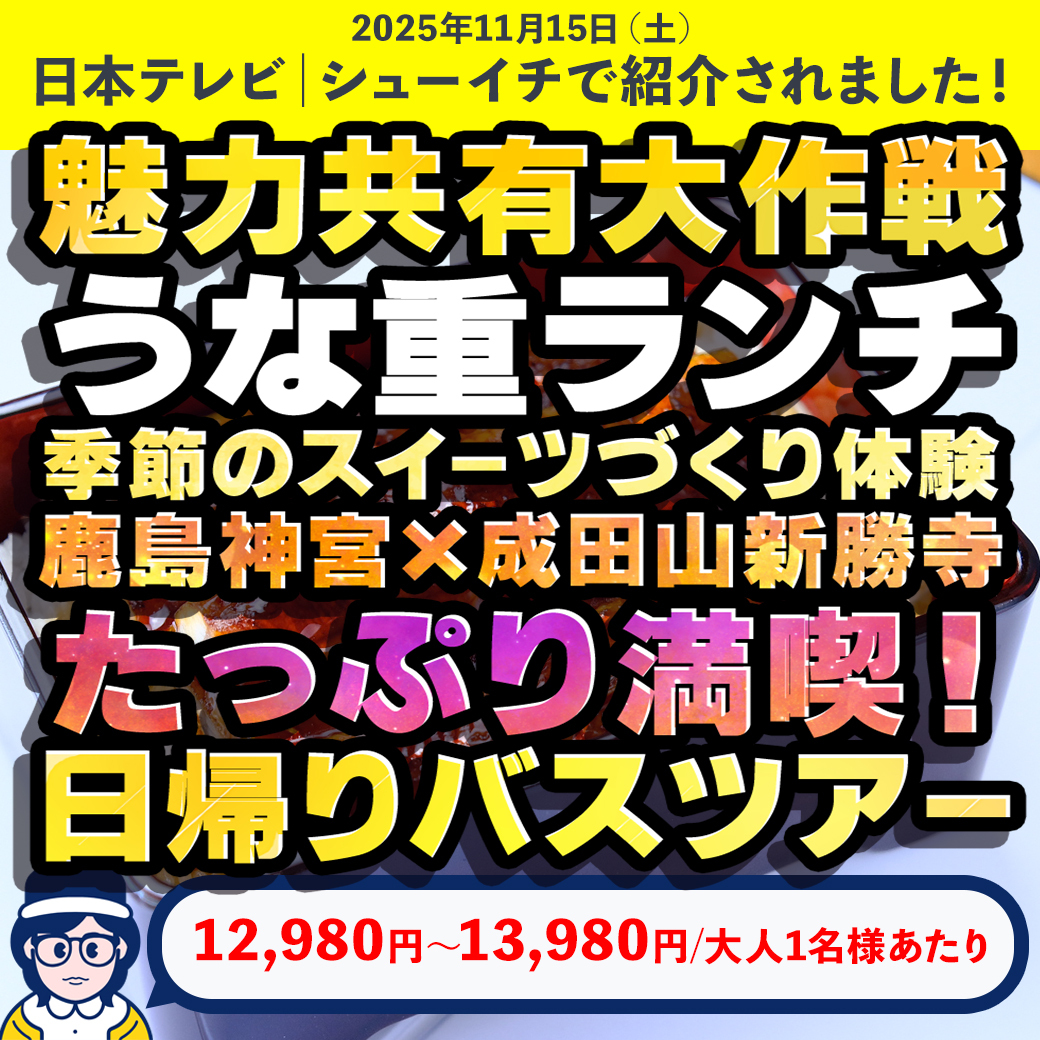 日本テレビ📺#シューイチ でご紹介いただきましたグルメも観光も楽しむ日帰りバスツアーWEB予約受付中です🚍うな重ランチやスイーツづくり体験!鹿島神宮や成田新勝寺のパワースポット✨ 旅行会社オリオンツアーをお見逃しなく💖 ➡orion-bustabi.com/kanto-feature/… #国内旅行 #家族旅行 #母娘旅 #カップル旅 pic.x.com/lLZ9wcNFSP
