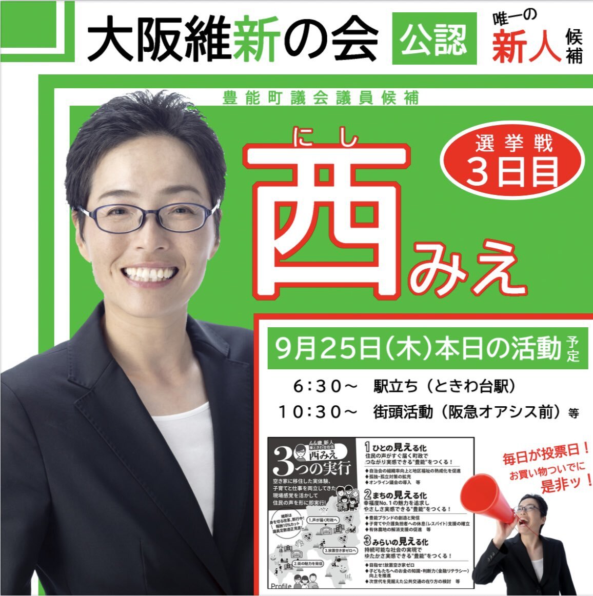【#豊能町議会議員選挙🗳️3日目】 選挙戦折り返し地点の本朝は #ときわ台駅🚉から活動開始致します! 街頭演説中にお配りしている証紙ビラは自分の想いの一部でありますが心を込めて作成いたしましたので、是非手にとってご一読頂ければ幸いです🥹 記事前投票もご活用ください✨ #毎日が投票日 pic.x.com/6wX6obJGzk