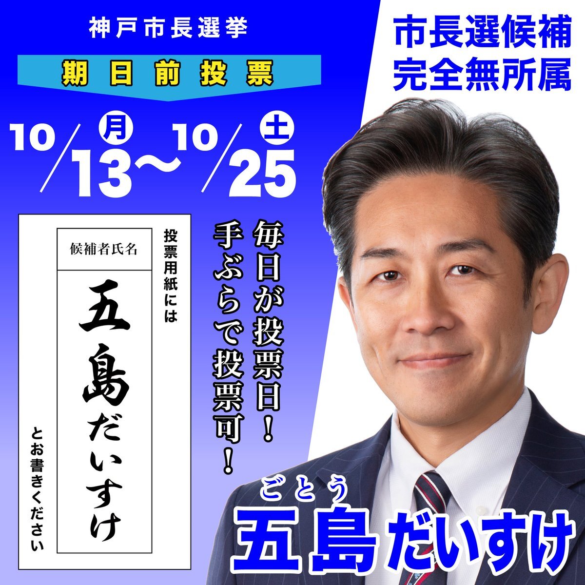 《📢#期日前投票に行こう❗️》 あなたの1票は「神戸の未来を創る第一歩」。ぜひ期日前投票で 📄投票用紙に 「 #五島だいすけ 」と書いて下さい❗️❗️ #神戸市長選挙 #俺がやる #五島だいすけ #毎日が投票日 #手ぶらで投票可 pic.x.com/IjS9xRJJhj