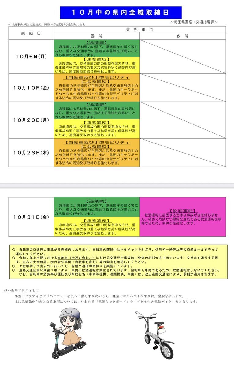 埼玉県内の公開交通取締 10月31日(金) 昼間:#県内全域取締日 過積載/速度超過 夜間:#県内全域取締日 飲酒運転の根絶! 今月最終日!交通ルールとマナーを守って 人も車も自転車も 安心・安全 埼玉県 天候等により内容は変更されます 他にも非公開交通取締があります #毎日交通事故防止運動 pic.x.com/uaMKk4TQLe