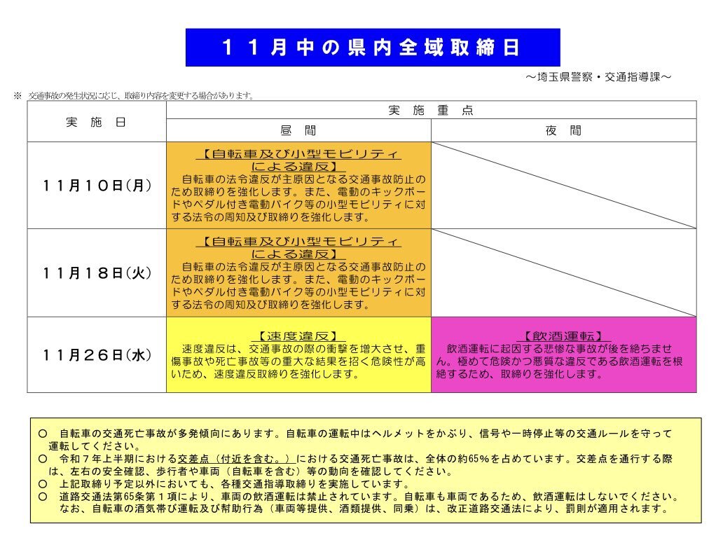 11月18日(火)埼玉 #県内全域取締日 自転車及び小型モビリティによる違反 自転車の法令違反が主原因となる交通事故防止のため取締りを強化します。また、電動のキックボードやペダル付き電動バイク等の小型モビリティに対する法令の周知及び取締りを強化します。 #毎日交通事故防止運動 pic.x.com/5qwjYwSxDV