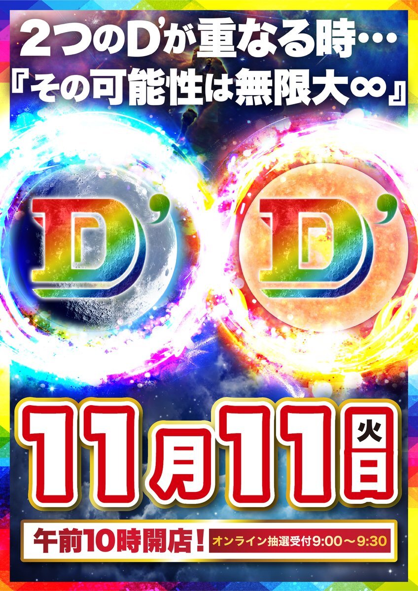 ども 明日の告知!!! お待たせしました 今月もやってきたゾロ目の日 11月11日(火) 午前10時OPEN 今回はシンプルに!素直に! それだけの事。 では明日お待ちしてます #Dステーション #ゾロ目 #毎月恒例 #それだけの事 #王の為 pic.x.com/F5pGm2OZS5