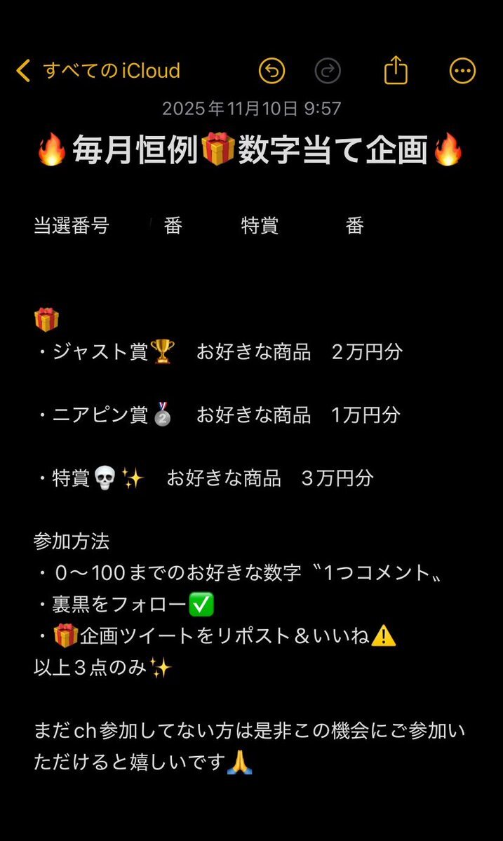 💀裏黒・自分で当てる🎁企画💀 毎月恒例〝数字当てイベント〟開催いたします🔥 1~100までの数字を〝1つ〟コメント📝 隠れている番号と[一致] またはジャスト賞と[1桁違い]でご当選となります🤫 〝直感と運〟に身を任せて… 《ラッキーマンはあなたかもね🫵》 超激安SALEも開催中です💁 11/14〆