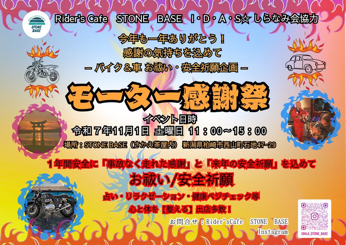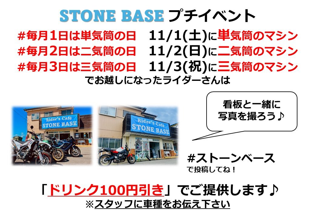 #ストーンベース 11月の営業日は現在調整中です! 先に、イベントの告知をさせて下さい♪ 11/1 にバイク&車のお祓い・安全祈願企画で、『モーター感謝祭』を行います✨ また、プチイベント #毎月1日は単気筒の日 #毎月2日は二気筒の日 #毎月3日は三気筒の日 は、対象車種は100円引きです♪ pic.x.com/D5bQnvLX3w