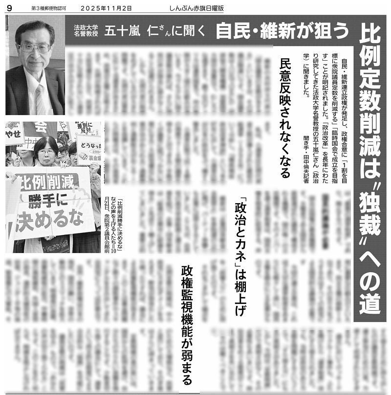 #赤旗日曜版 #11月2日号 自民・維新が狙う #比例定数削減 は“独裁”への道 法政大学名誉教授 #五十嵐仁 さんに聞く pic.x.com/BO5mCMEByo