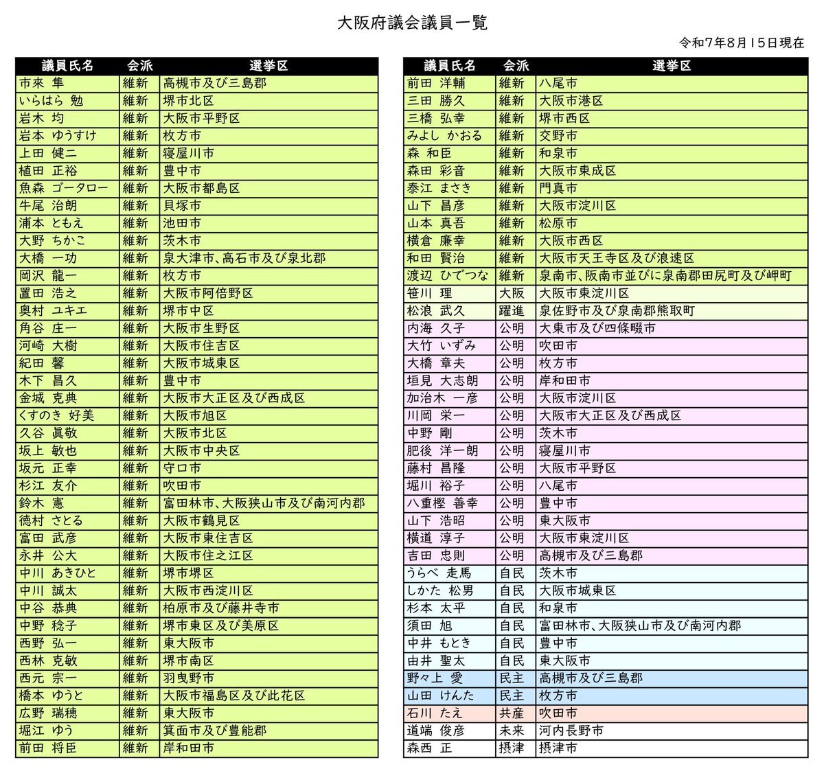 大阪府議会の議員定数を79名にまで減らし、しかも一人区を増やした結果の、現在の大阪府議会議員一覧です。51名(約65%、黄緑色)が維新の圧倒的維新単独過半数になっており、独裁政治が可能です。 x.com/aomurasaki_ll/…