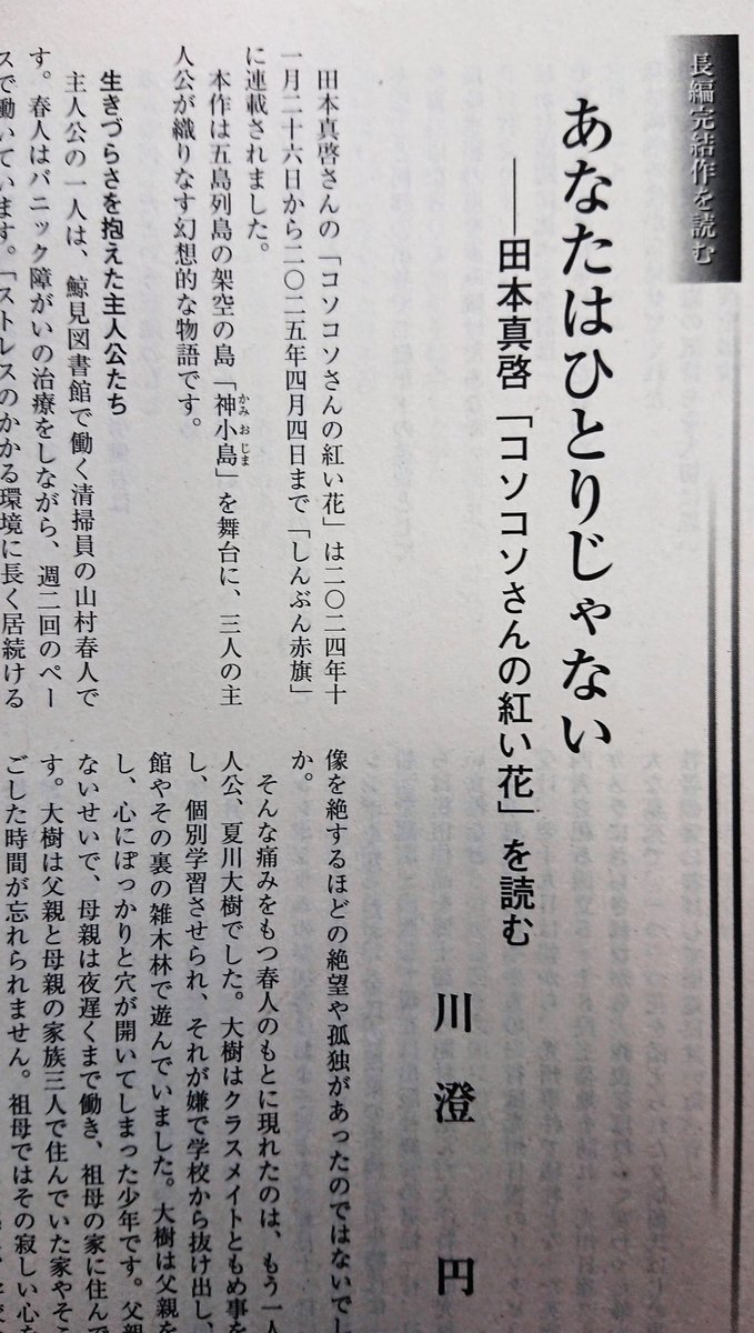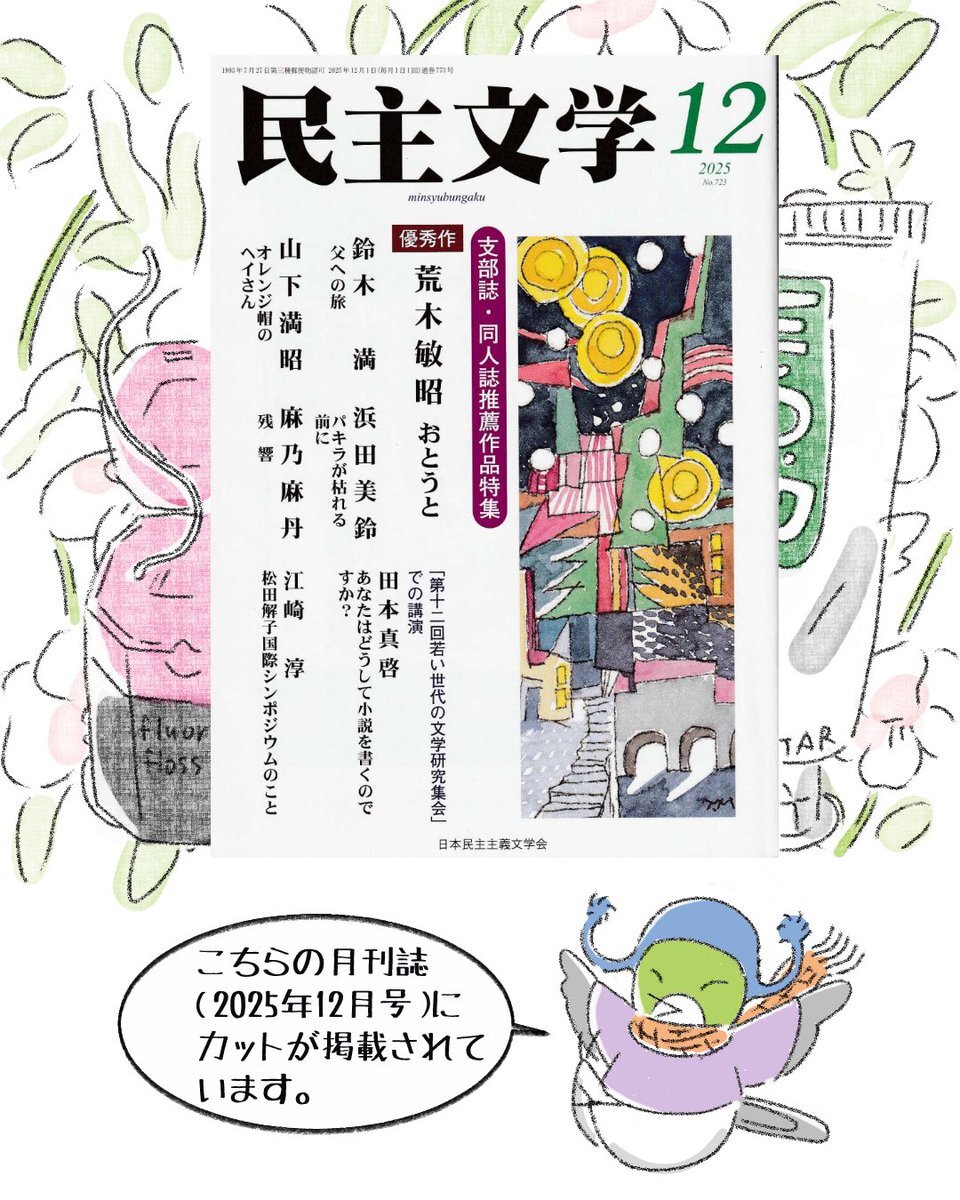 お久しぶりです。 中の人・植月は、多忙な労働による過労や体調不良により、文学会どころではない状態でした。ポストをサボってしまい申し訳ございません……🙇 さて #民主文学 12月号に、弊支部所属の川澄円が #田本真啓 の「 #コソコソさんの紅い花 」の評論を寄稿しています! ぜひご購入を! x.com/Proleta_Minbun…