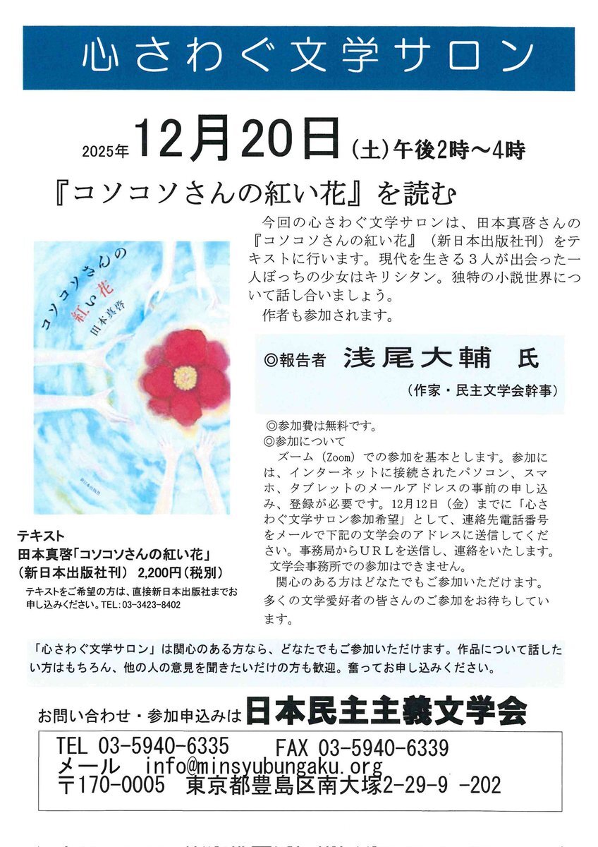 12月20日午後2時から、日本民主主義文学会が「心さわぐ文学サロン」というイベントを開催します。拙著「#コソコソさんの紅い花」を「#立春大吉」をお書きなられた小説家 #浅尾大輔 さんが報告して下さいます! 会員以外のかたでも参加できますので、ご興味のあるかたはぜひお申し込み下さい😊#民主文学 pic.x.com/gY1o0TuDyK
