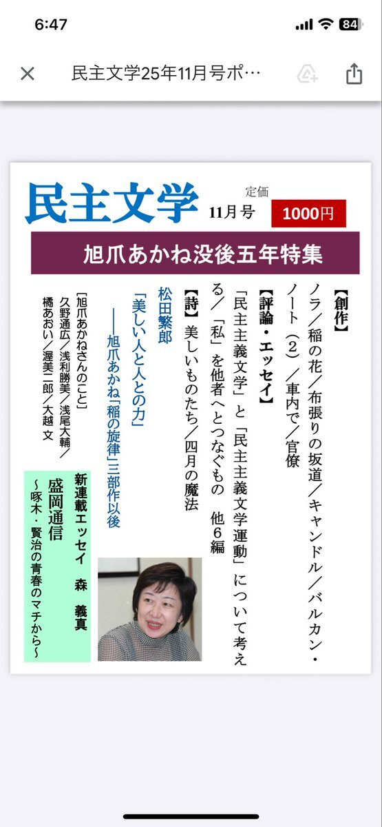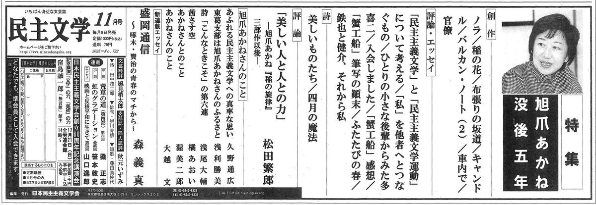民主文学』2025年11月号は作家の旭爪あかね没後5年特集。単行本に収録されていない小説、詩、エッセイを掲載。好評発売中!美和書店では売り切れ、追加の入荷待ちとのことです!!! #民主文学 #旭爪あかね pic.x.com/XihdswUuOL
