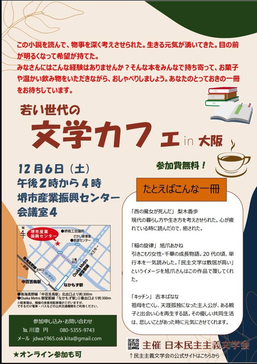 12月6日(土) 「#若い世代の文学カフェin大阪」があります。自分の好きな作品をみんなでわいわい語り合うイベントなので、ぜひお気軽にお申し込み下さい😊 #民主文学 #本好きな人と繋がりたい pic.x.com/QnPK0vmU9g