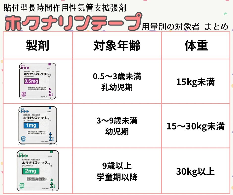 ホクナリンテープの使用量の境目で迷った経験、ありますよね。。 迷ったときは 「39(サンキュー)ホクナリンテープ」 を思い出して、体重別ガイドも確認するのがおすすめ! 医師や薬剤師に相談することも大切です🥸 咳が悪化しやすい時期ですので皆さんご注意を。 #気管支喘息 #アレルギー #小児 pic.x.com/jU7YVa5o2W