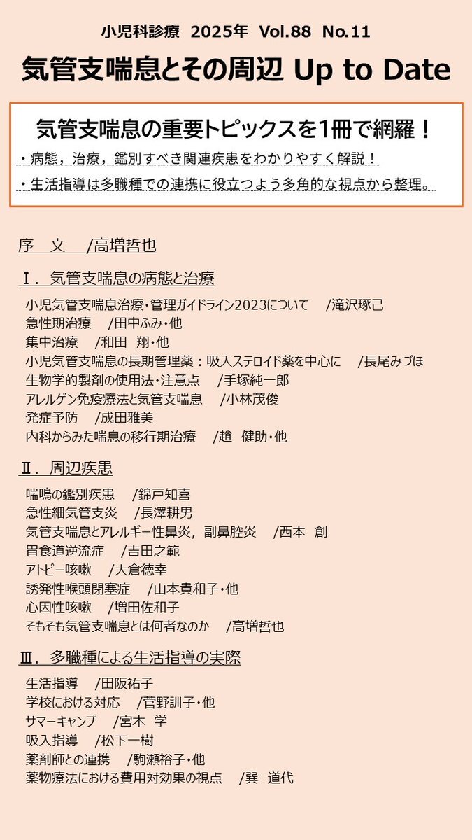 小児科診療最新11号の高増哲也先生ご企画【気管支喘息とその周辺 Up to Date】は、鑑別疾患や生活指導についてもわかりやすく解説した、日々の診療にお役立ていただける1冊です! 明日から開催の日本アレルギー学会学術大会でご登壇の先生方にも多数ご執筆いただきました。 #気管支喘息 #小児科診療 pic.x.com/7OUDHWBLxj