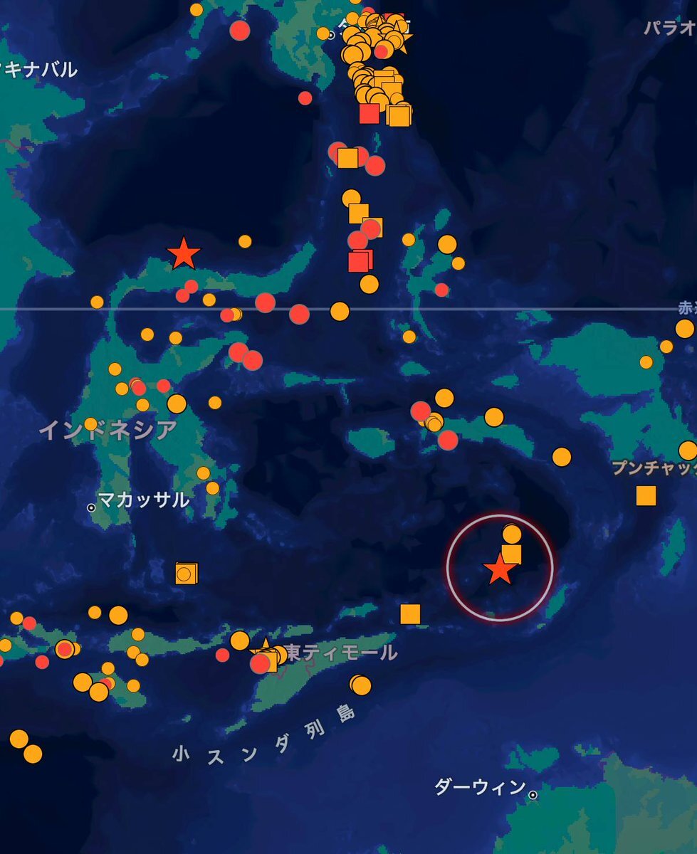 【インドネシア M6.4の地震】 ❗️ 地震は日本時間で23時40分に発生。震源はインドネシア東部マルク諸島から南西の太平洋海域。震源の深さは143.6キロ。米地質調査所が発表した。 現在のところ、これによる人的物的被害及び津波警報は明らかにされていない。