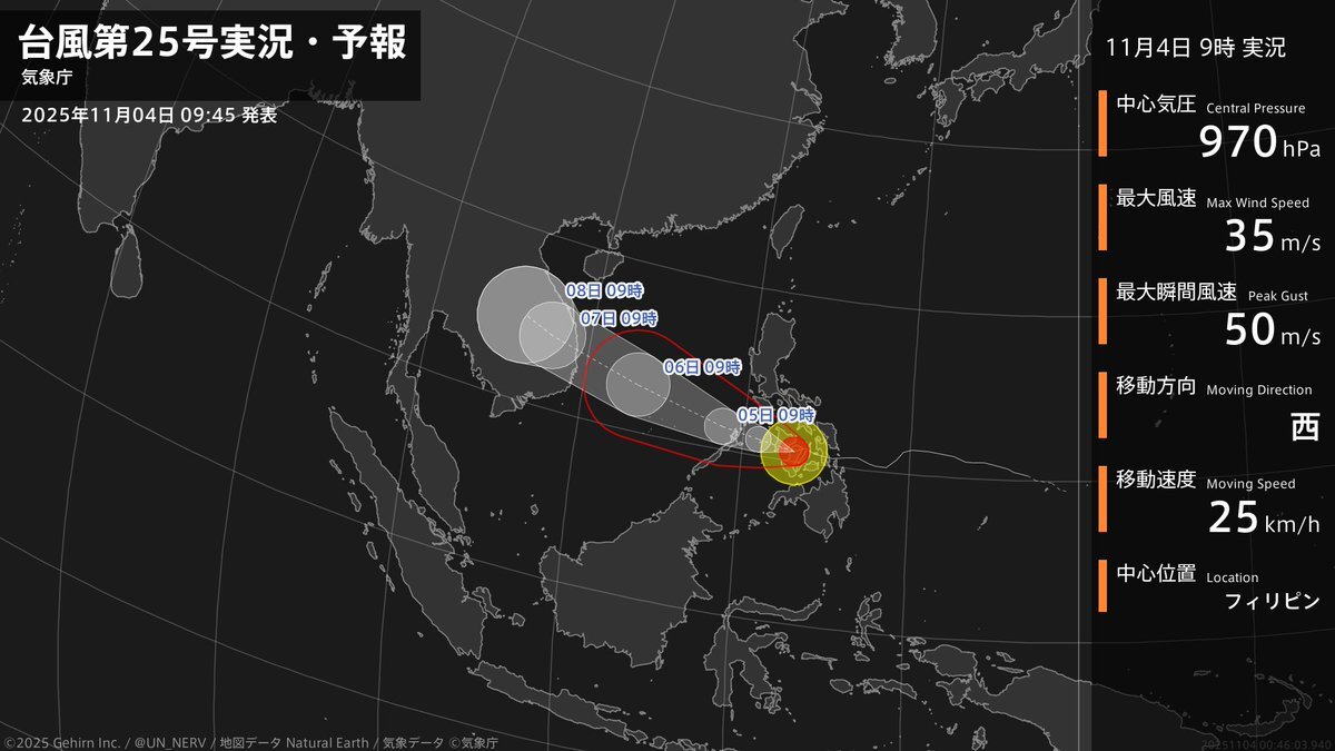 【台風第25号実況・予報 2025年11月04日 09:46】 強い台風第25号(カルマエギ)は、フィリピンを1時間に25キロの速さで西に進んでいます。