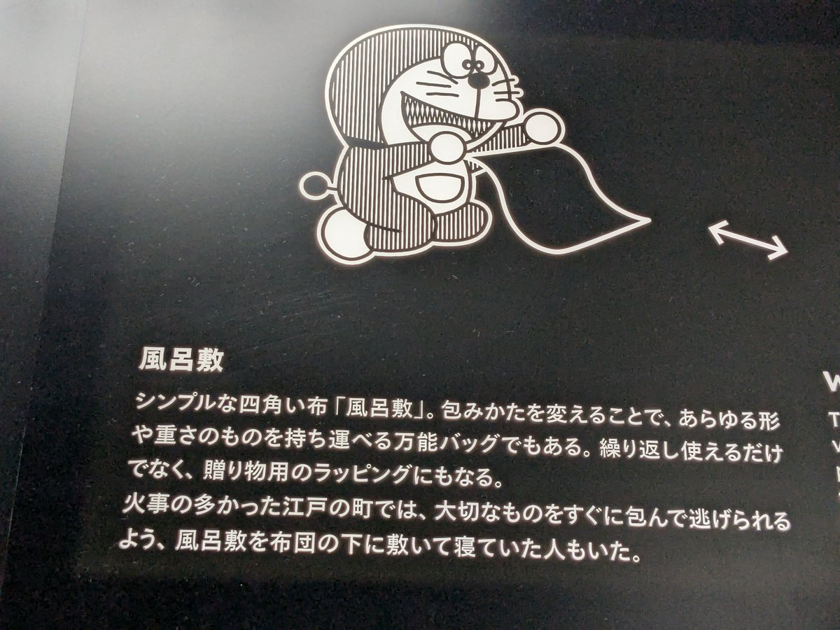 #大阪・関西万博 #日本館 の展示物 #風呂敷 は繰り返して使うことができるエコなもの。日本の代表的キャラクター、#ドラえもん を登場させて解説 11月8日は、#水循環に思いをはせる日 だったので、ゴミから水、熱、電気を作っていて、リサイクル、循環がテーマの日本館について、ツイートしました pic.x.com/2W9JbPvtZ1