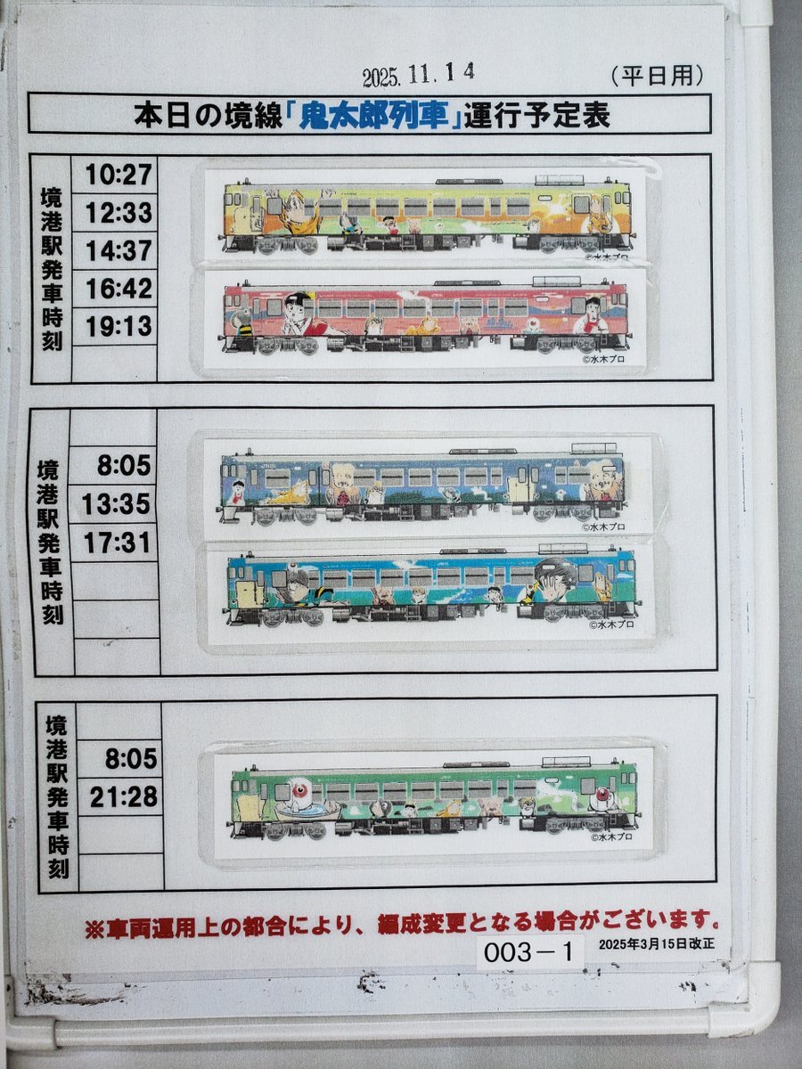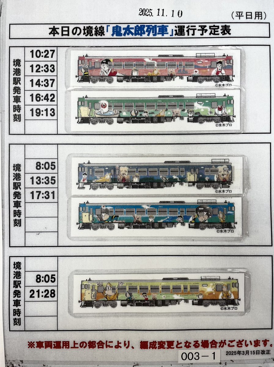 本日2025年11月10日(月)鬼太郎列車運行予定はこちらです。 提供:JR西日本 #境港市 #JR境線 #鬼太郎列車 #水木しげるロード pic.x.com/ONX1S6GcXI