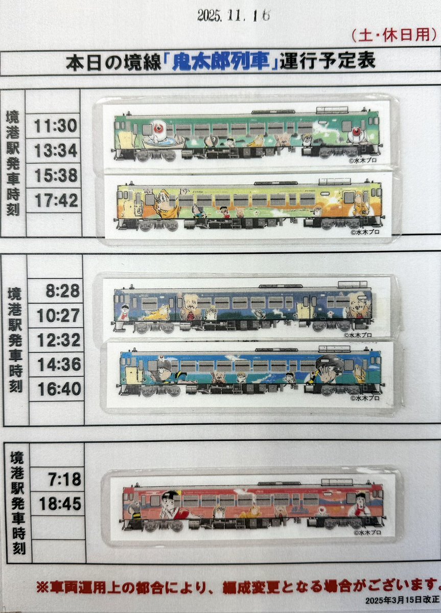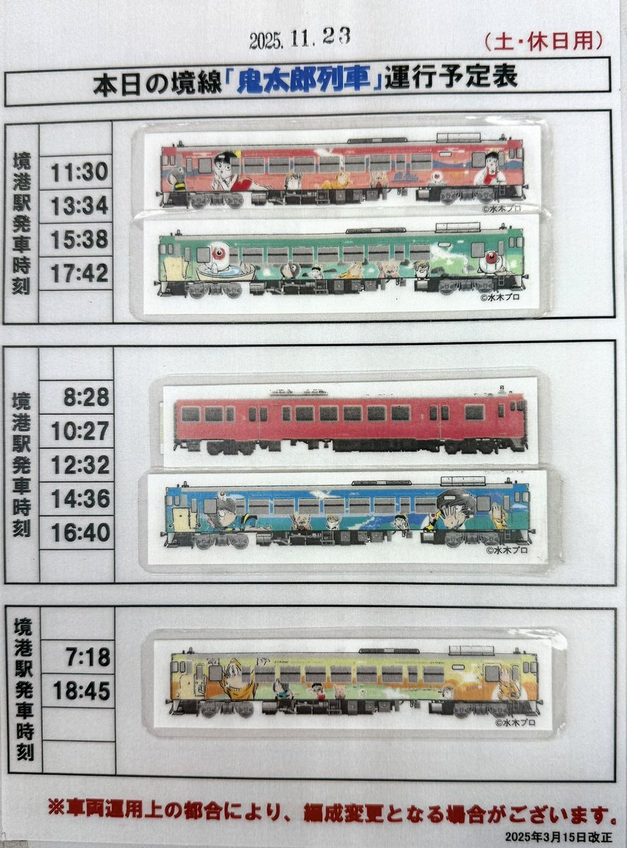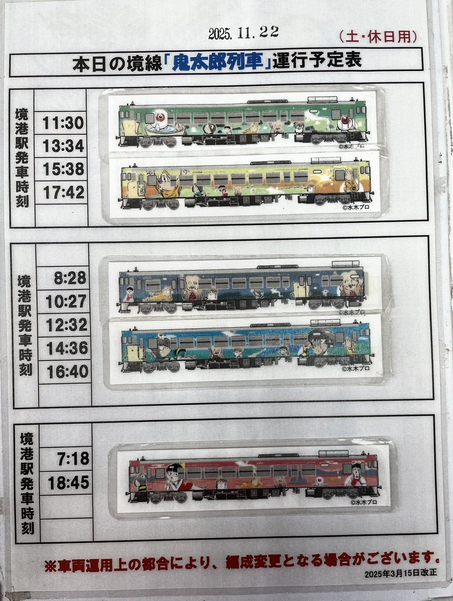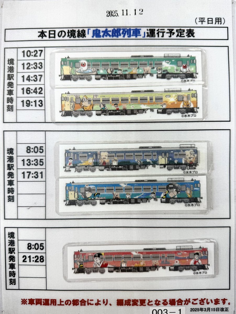 本日2025年11月15日(土) 鬼太郎列車運行予定はこちらです。 提供:JR西日本 #境港市 #JR境線 #鬼太郎列車 #水木しげるロード pic.x.com/2ypLxpS9n4