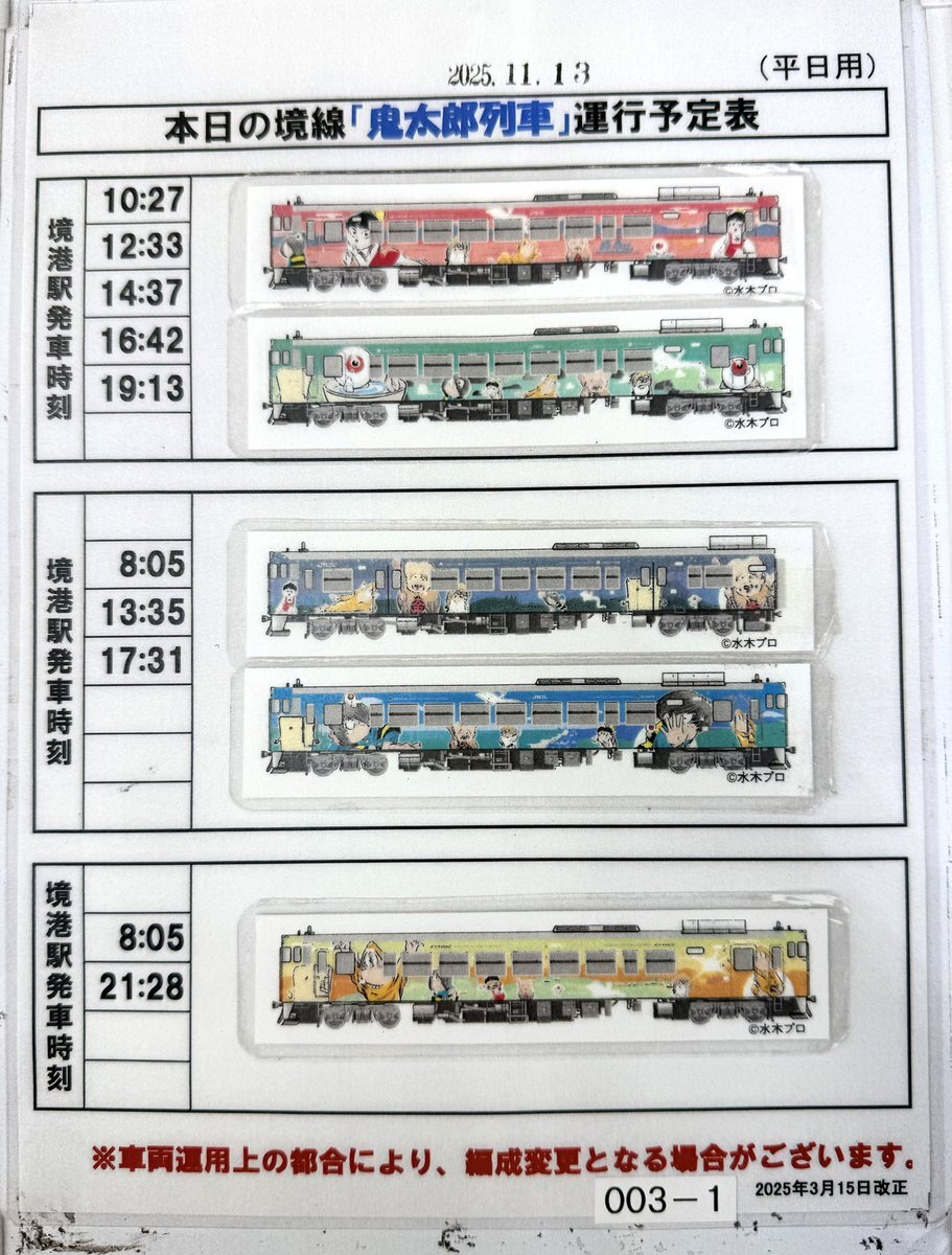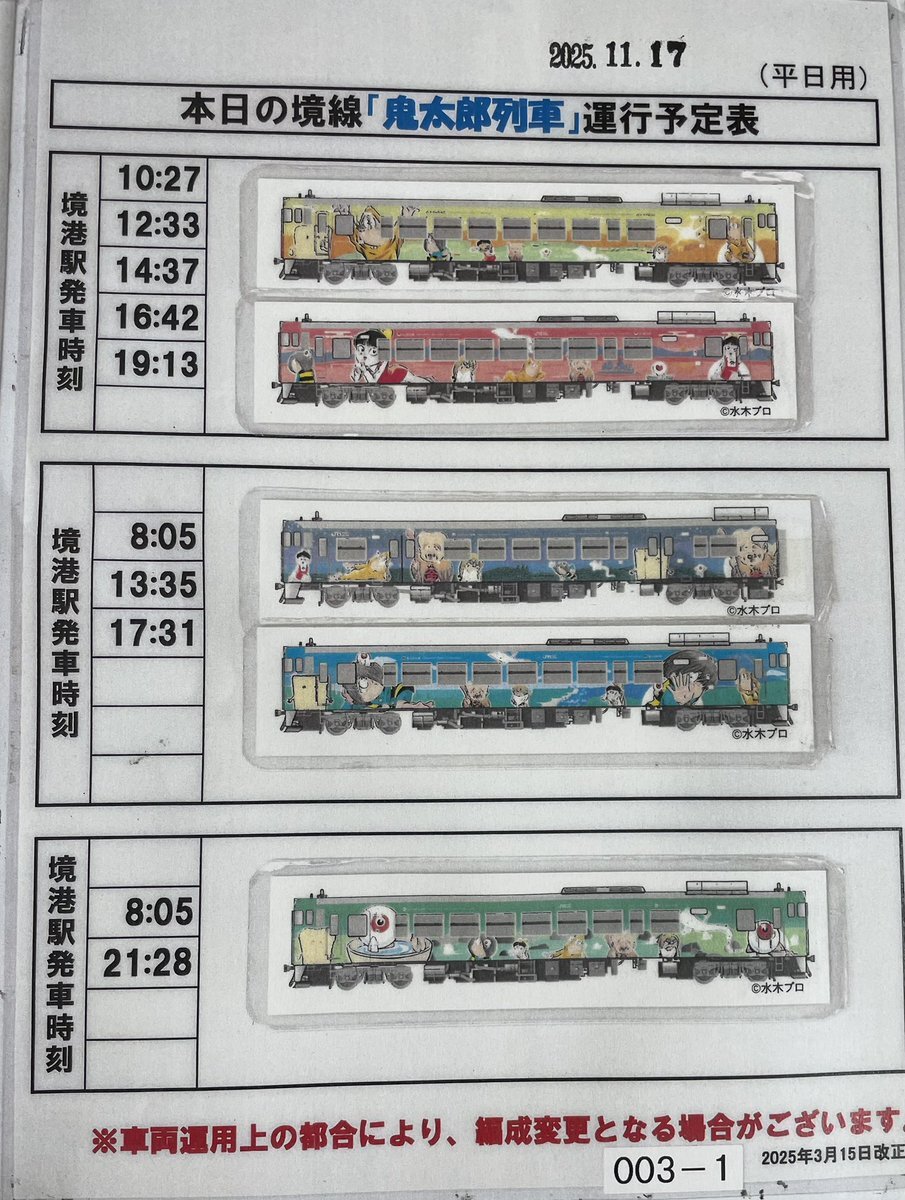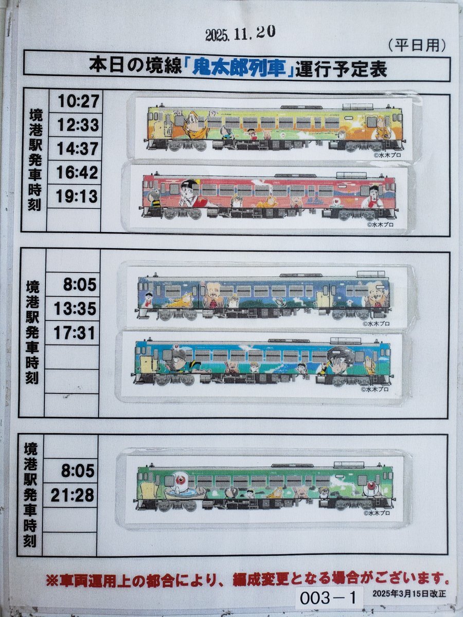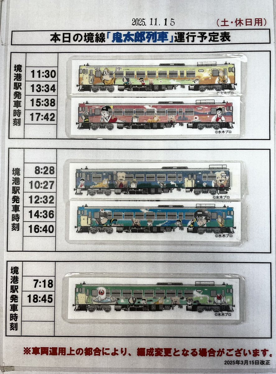 本日2025年11月15日(土) 鬼太郎列車運行予定はこちらです。 提供:JR西日本 #境港市 #JR境線 #鬼太郎列車 #水木しげるロード pic.x.com/2ypLxpS9n4