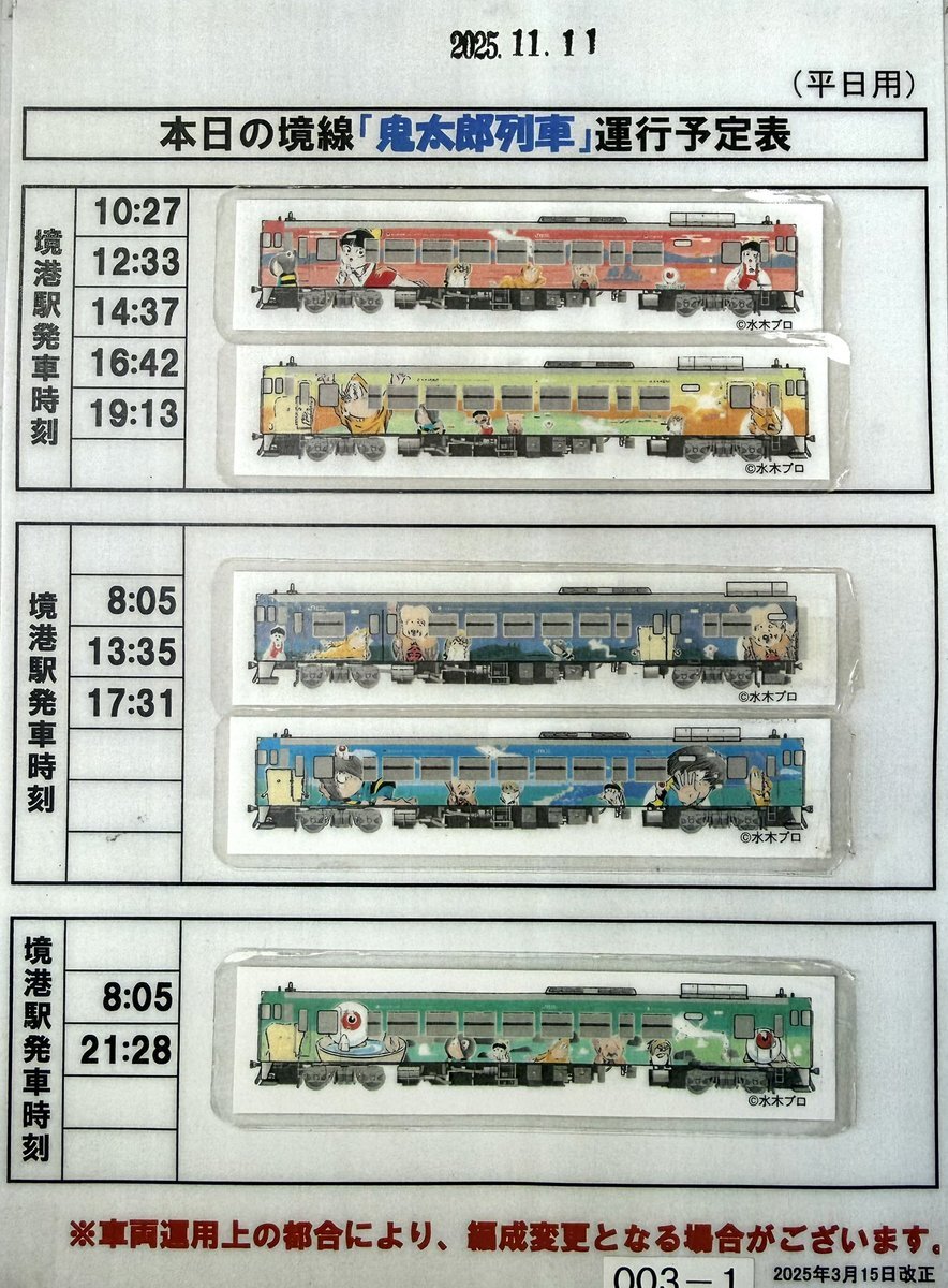 本日2025年11月11日(火)鬼太郎列車運行予定はこちらです。 提供:JR西日本 #境港市 #JR境線 #鬼太郎列車 #水木しげるロード pic.x.com/7YAodTsa8s