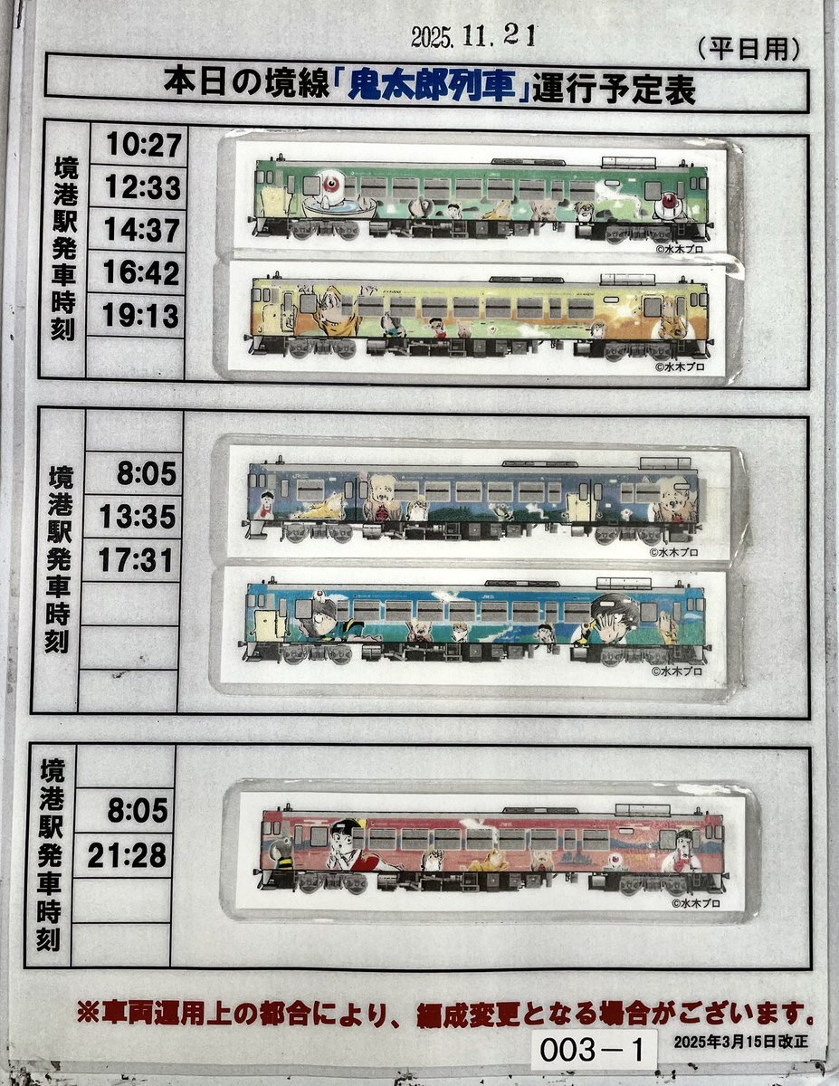 本日2025年11月21日(金)鬼太郎列車運行予定はこちらです。 提供:JR西日本 #境港市 #JR境線 #鬼太郎列車 #水木しげるロード pic.x.com/cVZQ2Kp7Wh
