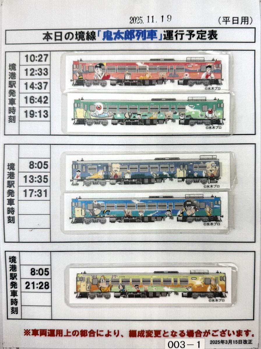 本日2025年11月19日(水) 鬼太郎列車運行予定はこちらです。 提供:JR西日本 #境港市 #JR境線 #鬼太郎列車 #水木しげるロード pic.x.com/4T0WaEkGGj
