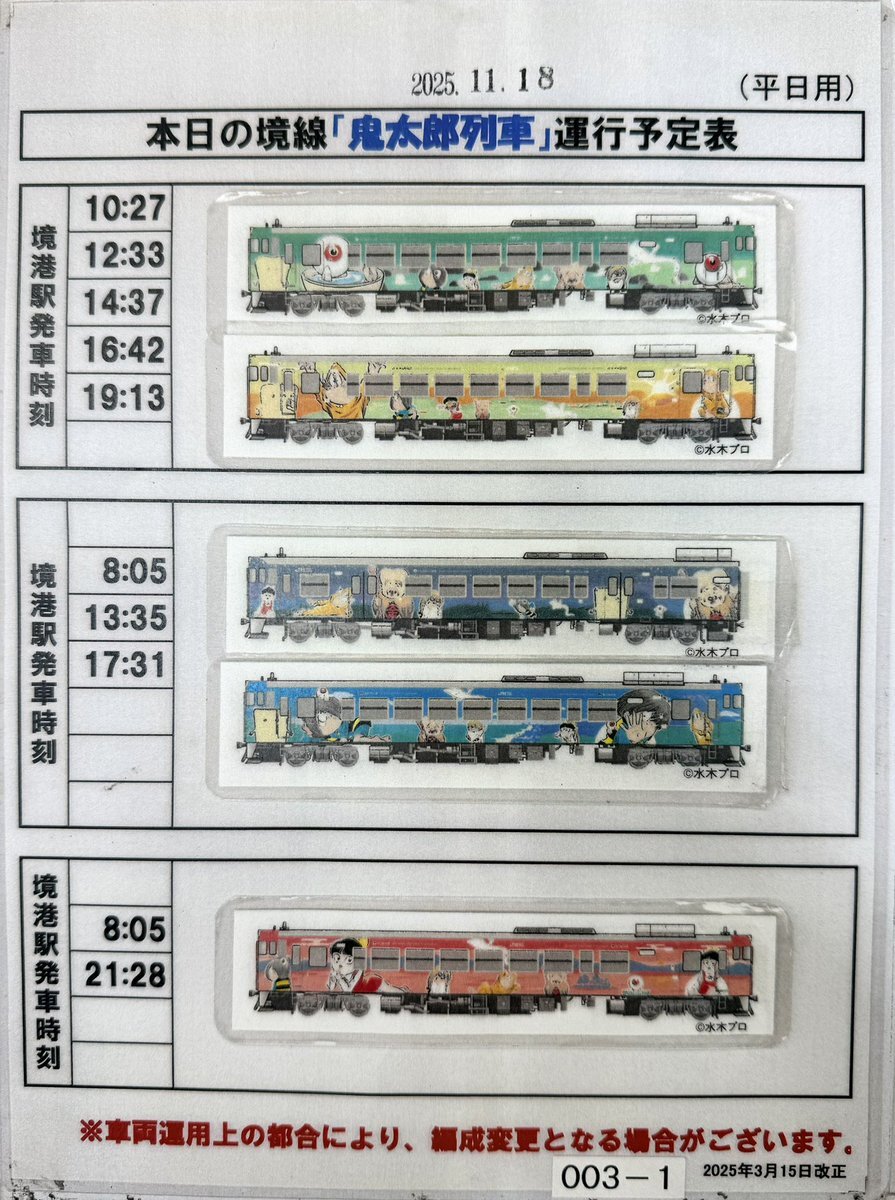 本日2025年11月18日(火) 鬼太郎列車運行予定はこちらです。 提供:JR西日本 #境港市 #JR境線 #鬼太郎列車 #水木しげるロード pic.x.com/9D5qQjwPEt