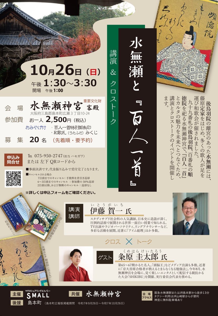 告知をすっかり忘れておりました こちら今日発行の広報誌に掲載されたので、早々に満席になる可能性があります お早めの申込みをおすすめします #百人一首 #競技カルタ #伊藤賀一 #粂原圭太郎 #水無瀬神宮 知識と話術に長けた仲良しのお二人のご登壇、面白いこと間違いなし!です☺️ pic.x.com/EIIfTMe1Xv