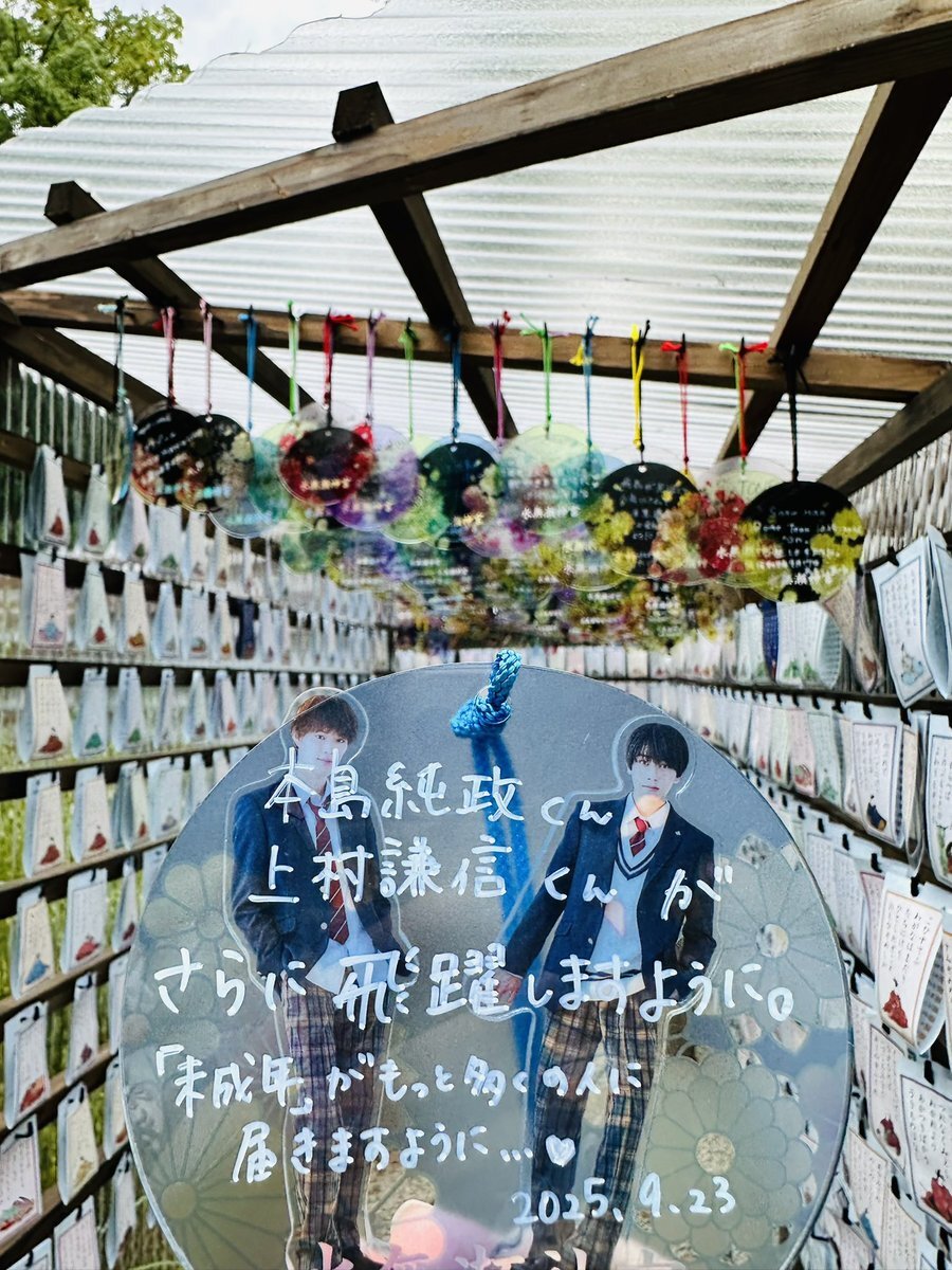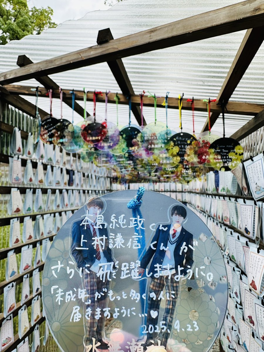 #ytv未成年#水無瀬仁 こと #本島純政 くんと #蛭川晴喜 こと #上村謙信 くんと #水無瀬神宮 を参拝 #叶絵馬守 が素敵です✨️10色と豊富やから推しへの祈願にバッチリ👌 海を連想して🌊🔵本島くんと上村くんの飛躍を祈願しました🔵 絵馬の後ろにアクスタを持ってくると華やかになったよ🥰 pic.x.com/IgSWaGdnrj