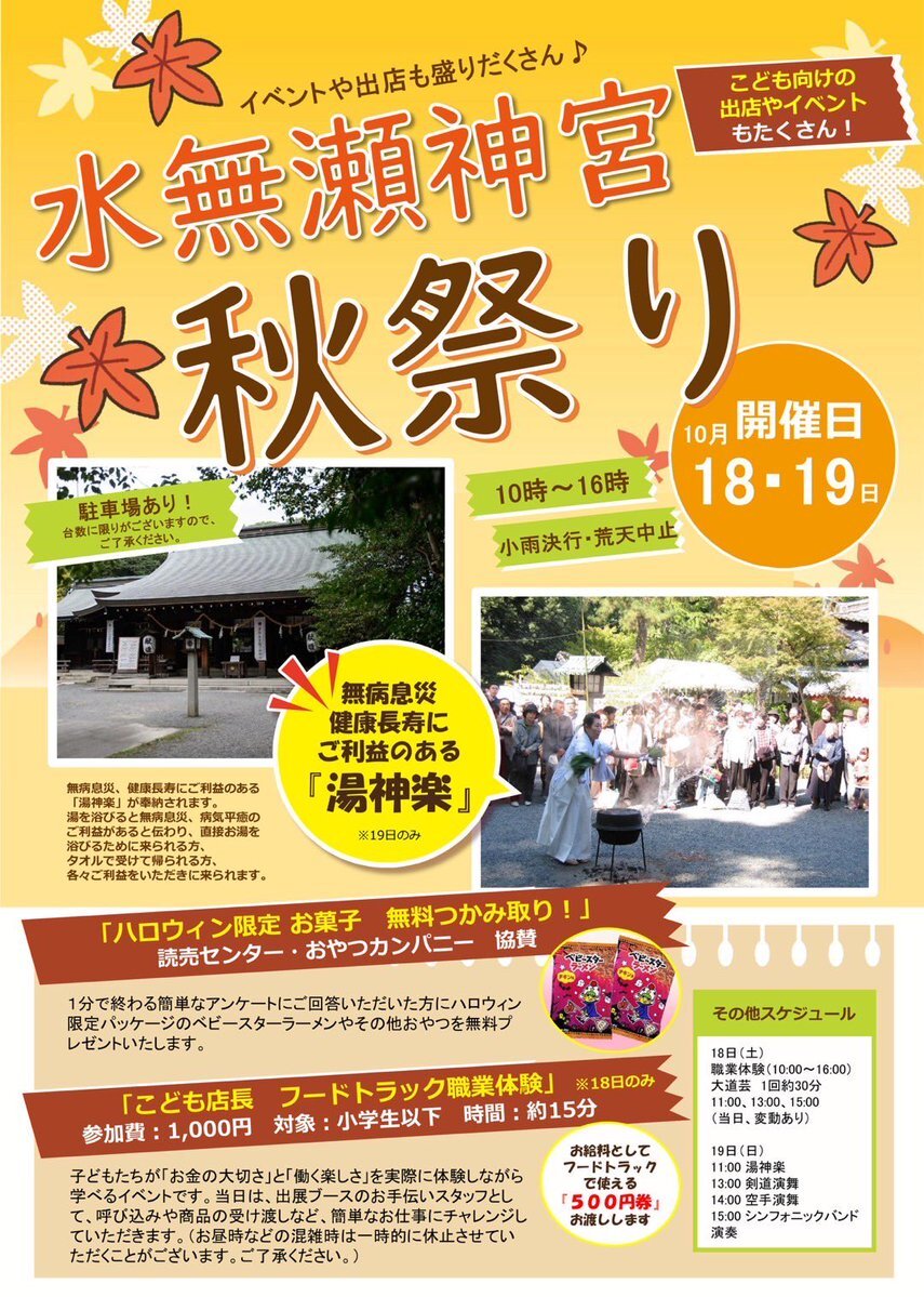 水無瀬神宮 秋祭り⛩️ 10/18(土)・10/19(日) 10:00-16:00 水無瀬神宮(大阪府三島郡島本町広瀬3丁目10-24) キッチンカーや縁日が多数出店! お菓子のつかみ取りやステージなどのイベントもあります! 大道芸は、19日のみ、11:00/13:00/15:00の3回行います!🤹 #水無瀬神宮 pic.x.com/IShtzVo6Dp