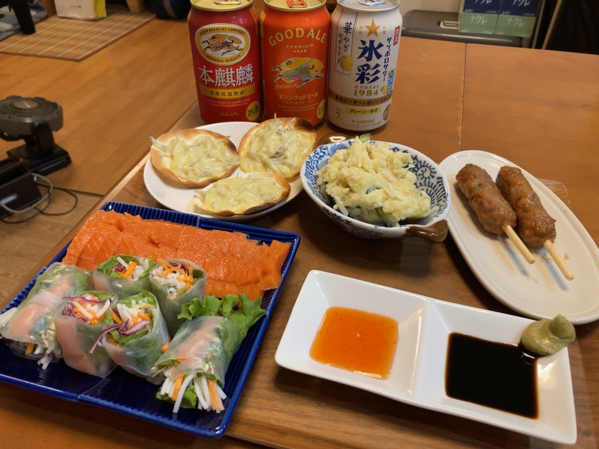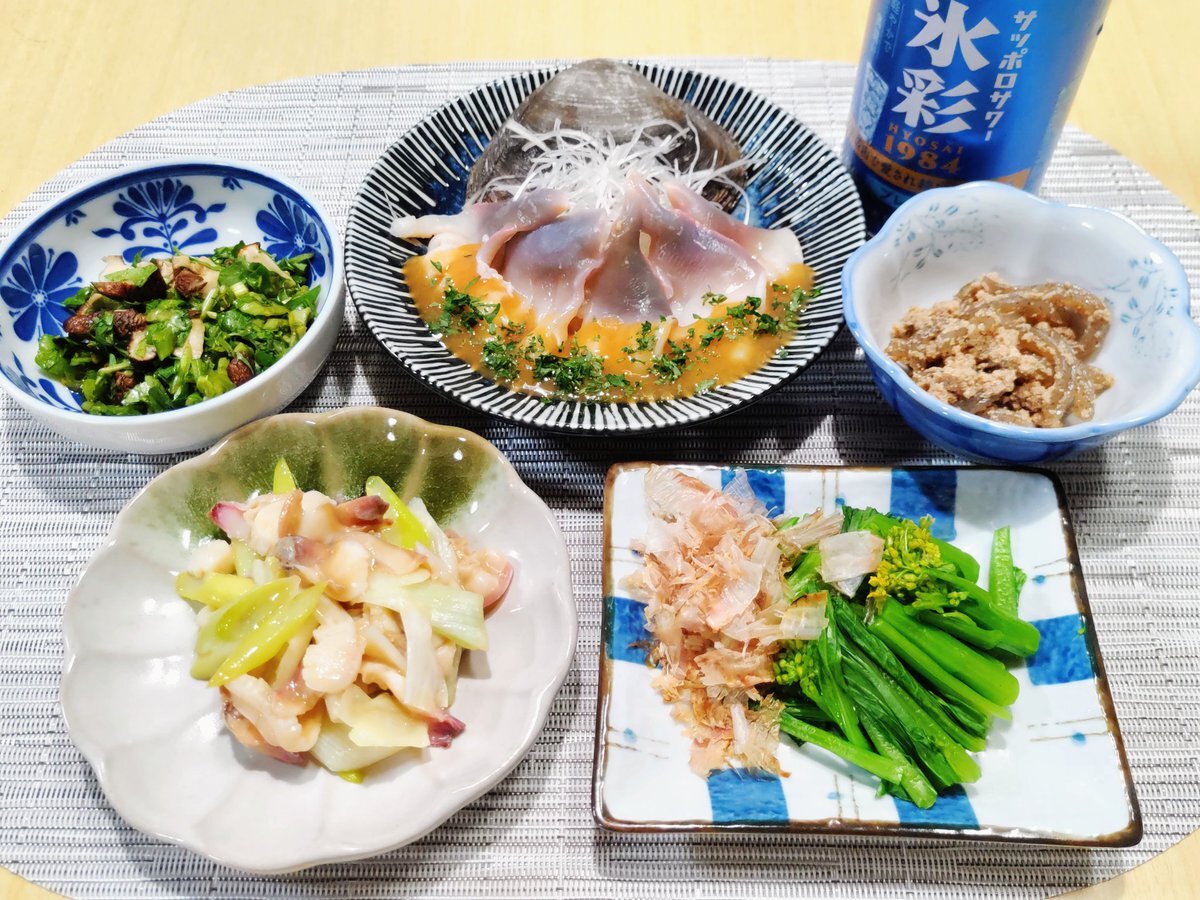夜ごはん🌛 北寄貝の酢味噌刺しとヒモのぬた🐚 クレソンと椎茸のわさび醤油和え🍄🟫 アスパラ菜のおひたし🥬 鱈子こんにゃく🐟 久しぶりのお酒🍺 北寄貝は酢味噌との相性もいいよ🙂↕️クレソンは栄養価が最強の野菜なのよ🌿 いろんなお酒あるけどやっぱ彩が好き🤍 #おうちごはん #氷彩 pic.x.com/gQj6x862YI