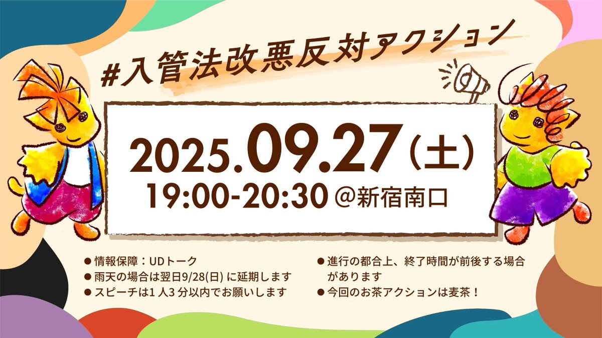 【拡散希望】 #入管法改悪反対アクション @新宿南口 9/27sat. 19:00-20:30 重要な局面です。 入管法を止めるための野党案は既に提出されました。あとは成立させるのみ。 成立できるか?それは民意で決まります。問われているのは私たちです。 立ち上がるか。諦めるか。 二択です。