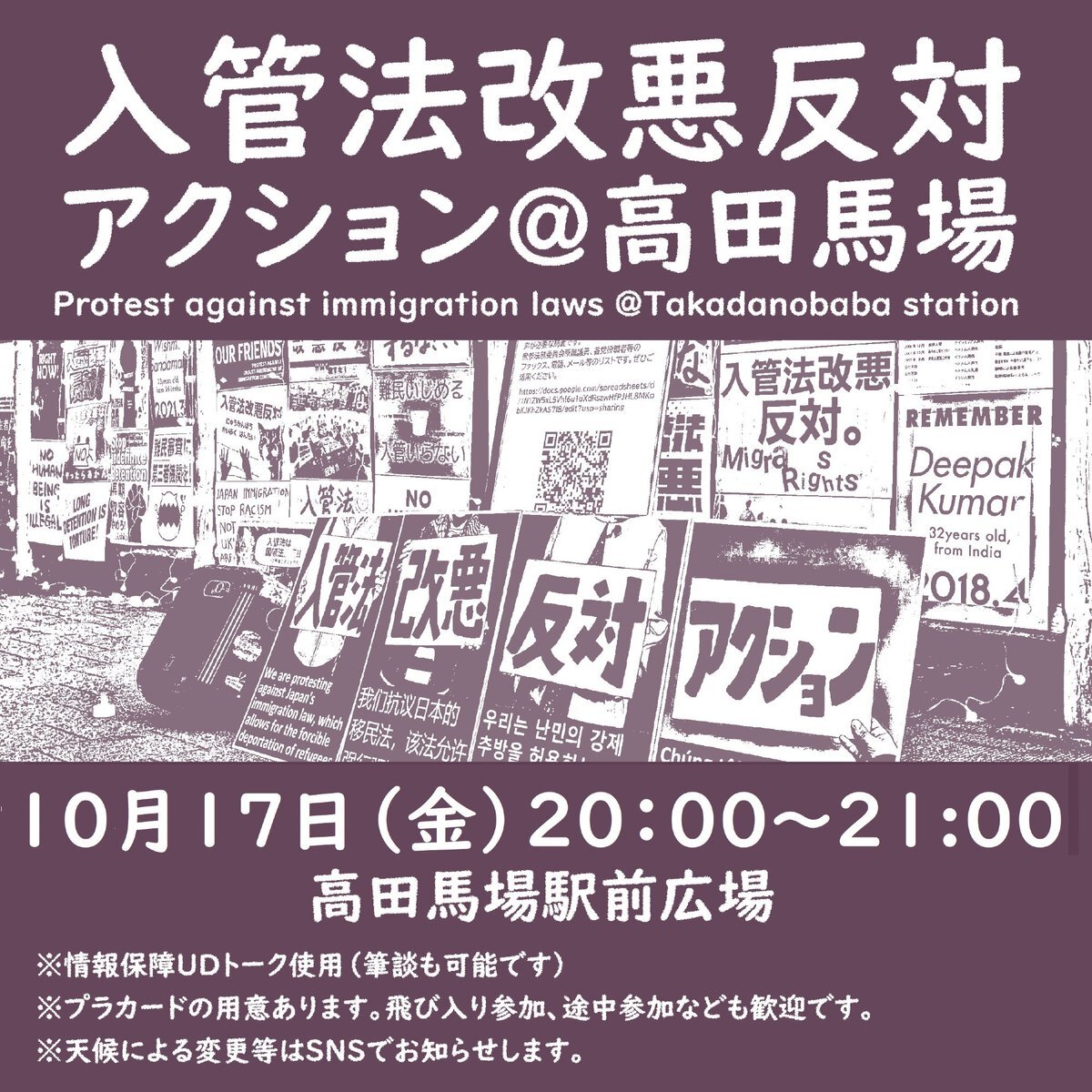 【拡散希望】 #入管法改悪反対アクション @高田馬場(駅前広場) 10月17日(金) 20:00~21:00 (Blueskyより転記) bsky.app/profile/hodges…