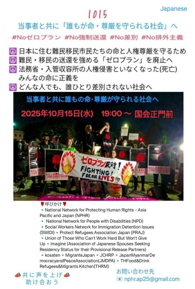 #拡散希望 #1015アクション 当事者と共に #誰もが命・尊厳を守られる社会へ 日時 : 2025-10-15(水)    19:00 〜 21:00 場所 : 国会議事堂正門前 🦜ググるマップ👇 maps.app.goo.gl/A2c3bRXvq1uuJV… 全国市民心から声を上げ 日本の(法務省 入国管理局)改定入管難民認定法のブラックボックスをかえよ🕊️#平等