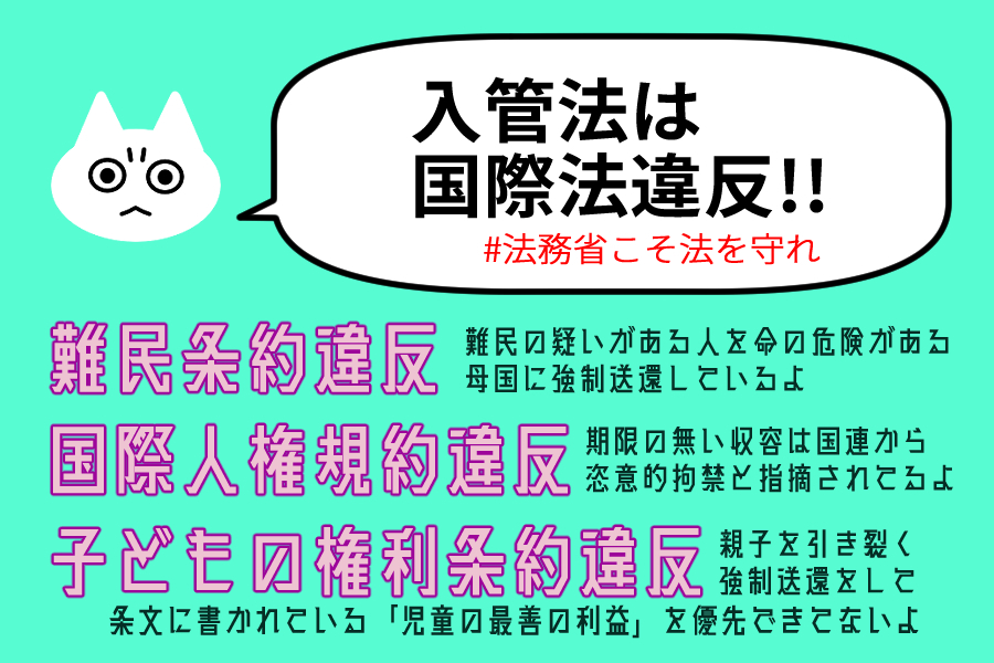 入管法は国際法違反! 入管庁も法務省も「ルールを守らない外国人」などと攻撃の犬笛を吹く、どの口が言うかと思う。 #法務省こそ法を守れ #入管法改悪反対アクション #排除ではなく共生を #日本社会はあらゆるルーツの人とともに #永住許可の取消しに反対します #国会開け pic.x.com/DQLoPE0mfx