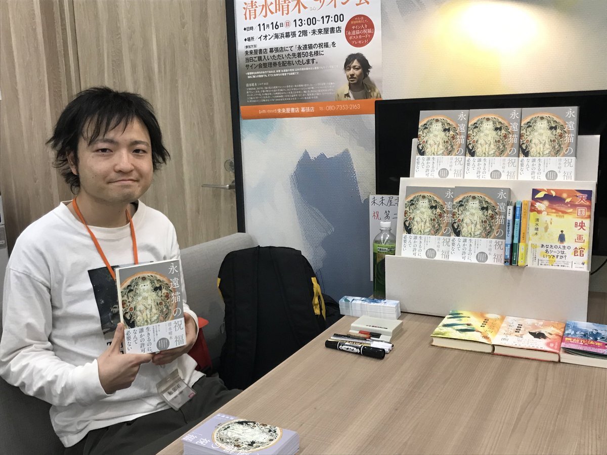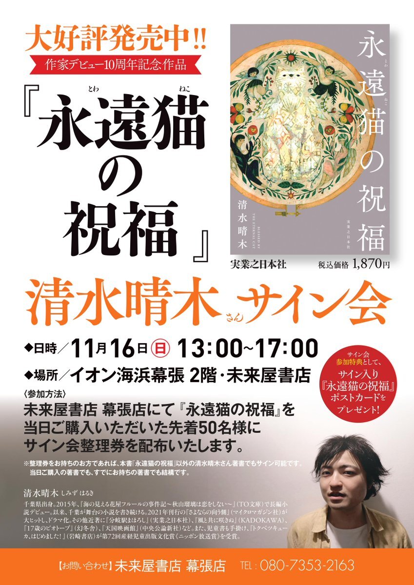 📚✨清水晴木さんサイン会開催決定✨📚 🗓日時:11月16日(日)13:00〜17:00 📍会場:未来屋書店 幕張店 🎟参加方法:当日 幕張店で『永遠猫の祝福』をご購入の方に、 先着順で整理券を配布いたします! 📞お問い合わせ:未来屋書店 幕張店まで #清水晴木 #サイン会 #永遠猫の祝福 #実業之日本社 pic.x.com/J8iwqwKSzJ