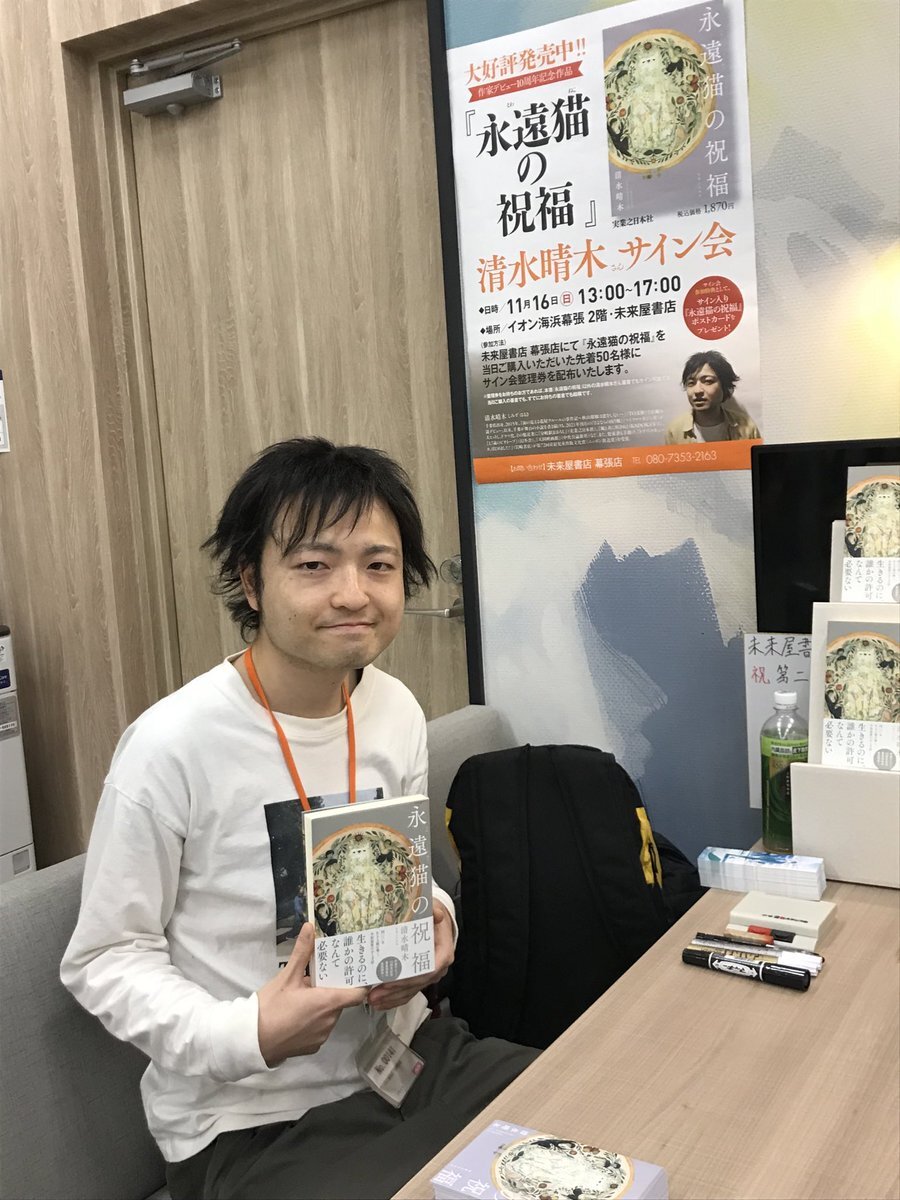 📚✨清水晴木さんサイン会開催決定✨📚 🗓日時:11月16日(日)13:00〜17:00 📍会場:未来屋書店 幕張店 🎟参加方法:当日 幕張店で『永遠猫の祝福』をご購入の方に、 先着順で整理券を配布いたします! 📞お問い合わせ:未来屋書店 幕張店まで #清水晴木 #サイン会 #永遠猫の祝福 #実業之日本社