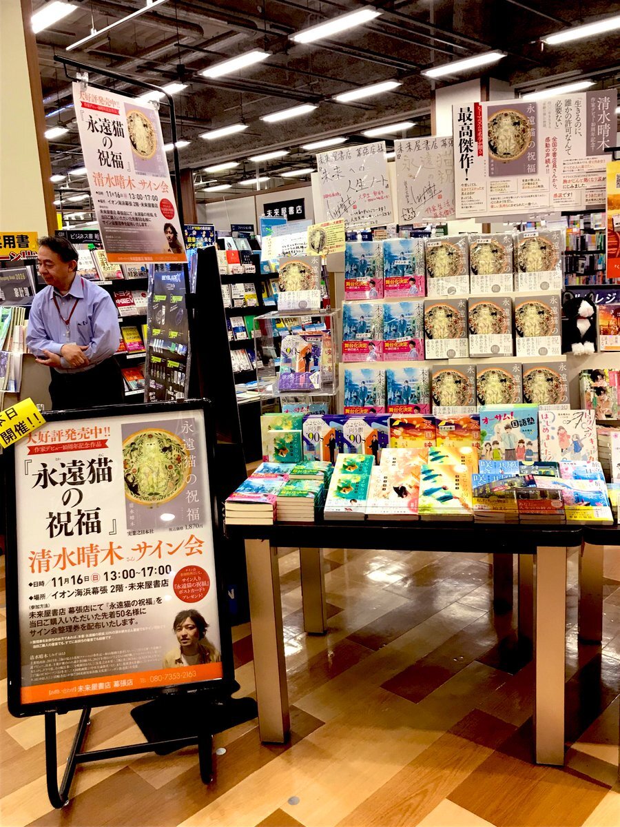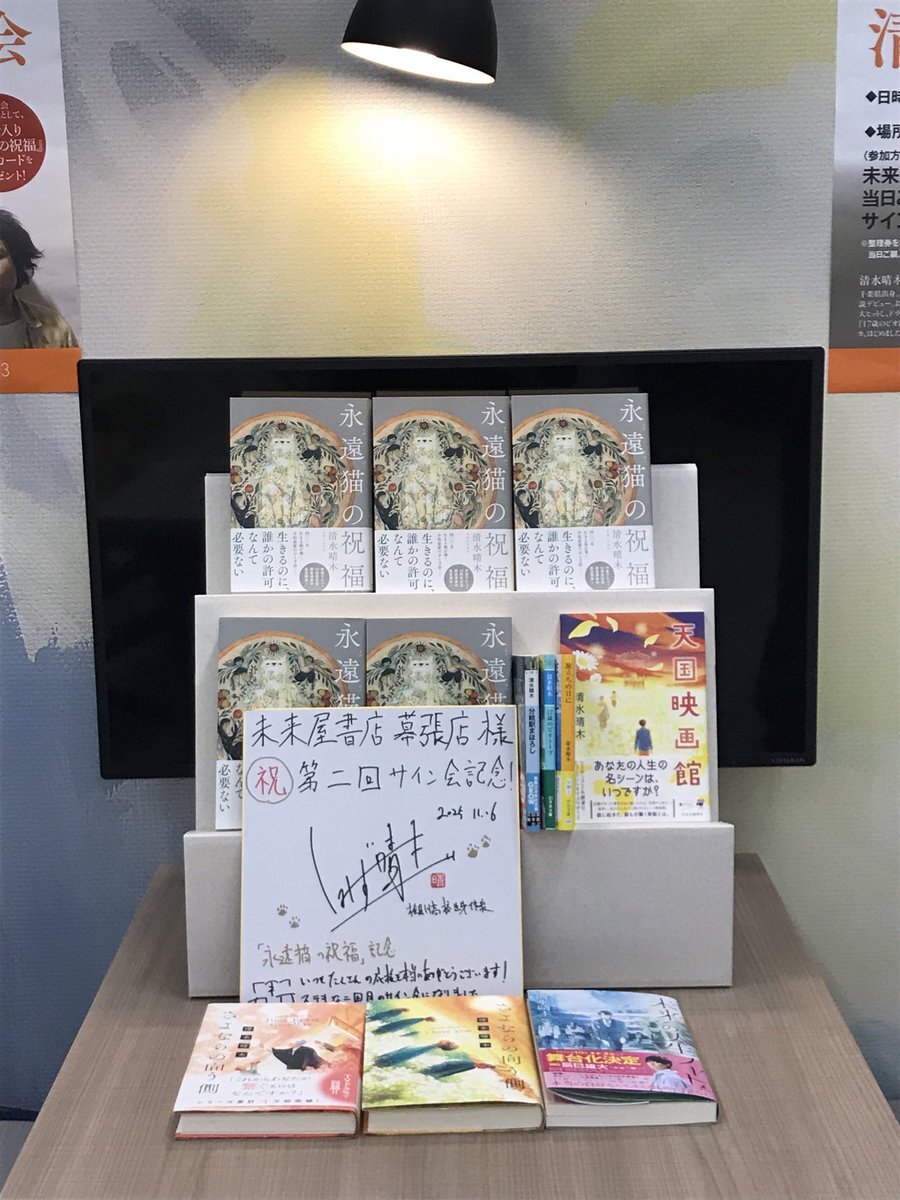 #永遠猫の祝福』 ご好評に感謝を込めて、著者 #清水晴木 先生のサイン会、まだまだ絶賛開催中です!@ #未来屋書店幕張店 17時までですが、駆け込み大歓迎‼️ 『永遠猫の祝福』以外にも、清水先生作品を多数取り揃えてお待ちしてまーす❣️ pic.x.com/LkHqNiyJFn